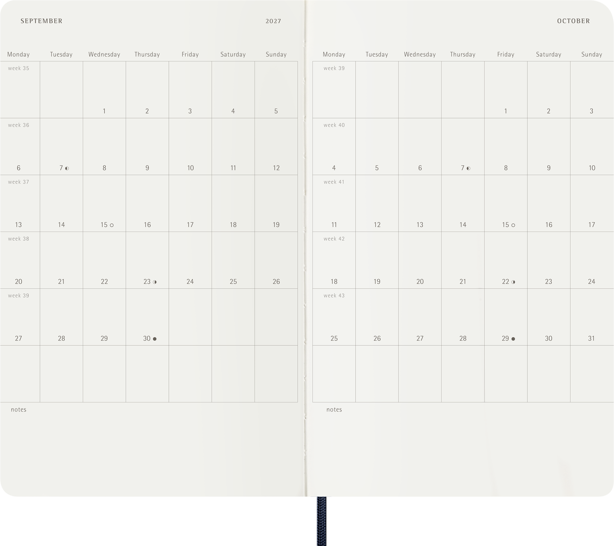 Dated from July 2026 to December 2027, the Moleskine 18-Month Weekly Planners let you see the whole week at a glance. This planner is also part notebook: each double-page spread shows the days of the week on the left opposite a ruled page for handwritten tasks and ideas. This format allows you to take notes alongside the week's plans, perhaps jotting down a to-do list, key reminders, and all the random thoughts that come to mind as you plan your time. Yearly and monthly snapshot pages provide a broader overview, alongside dedicated space for travel planning, ideas and goals. Like all Moleskine planners, it includes stickers to personalise your pages, plus year stickers for the spine.