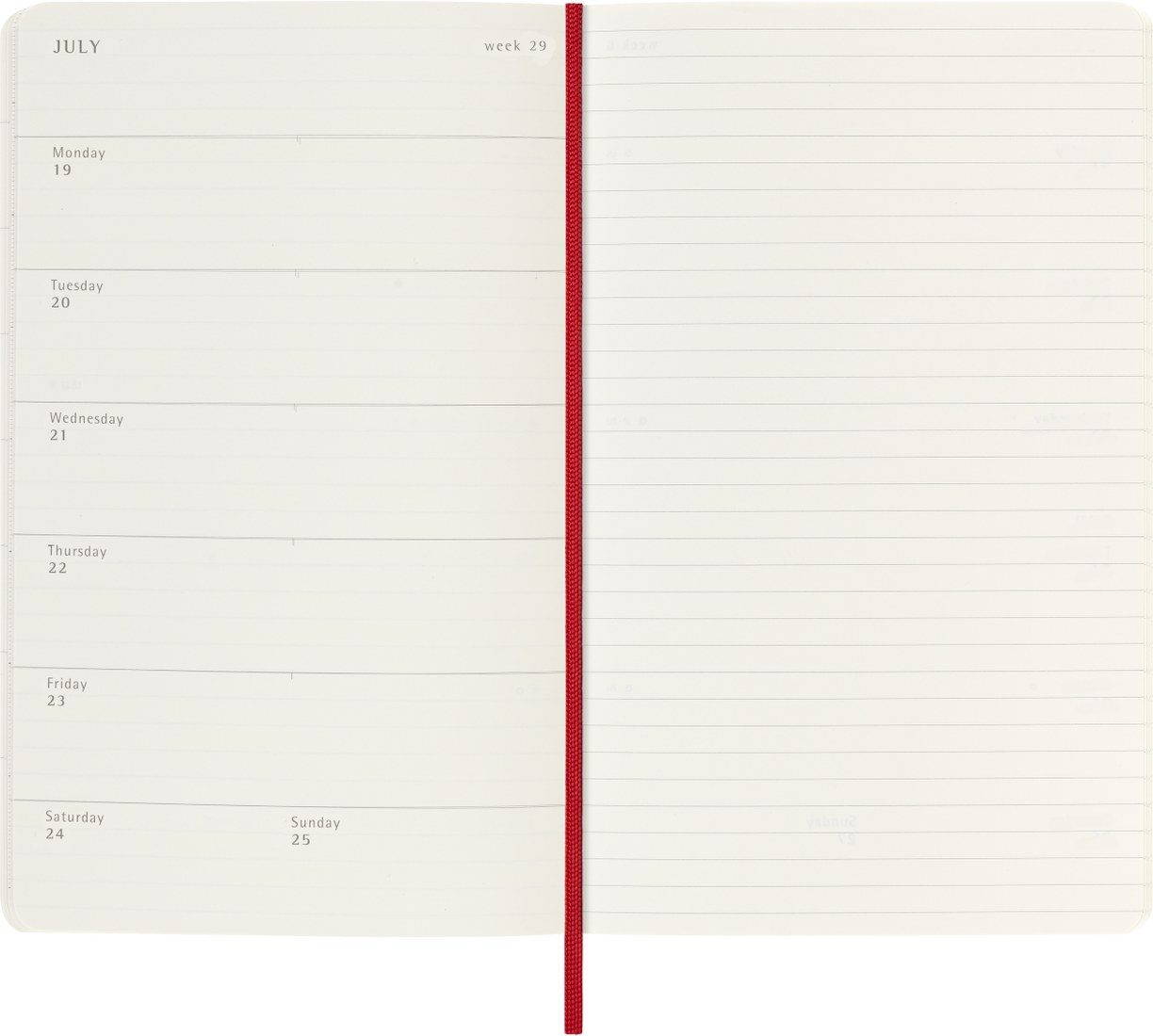 - Format: Weekly Notebook (days of each week on one side, a ruled page for tasks and notes on the other)