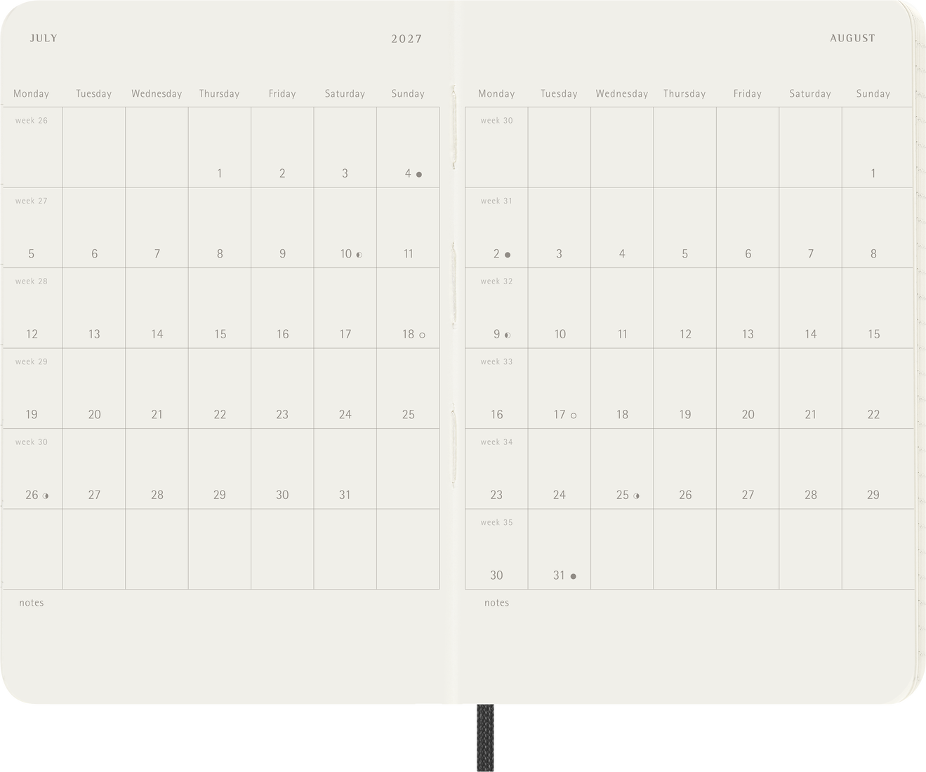 Dated from July 2026 to December 2027, the Moleskine 18-Month Weekly Planners let you see the whole week at a glance. This planner is also part notebook: each double-page spread shows the days of the week on the left opposite a ruled page for handwritten tasks and ideas. This format allows you to take notes alongside the week's plans, perhaps jotting down a to-do list, key reminders, and all the random thoughts that come to mind as you plan your time. Yearly and monthly snapshot pages provide a broader overview, alongside dedicated space for travel planning, ideas and goals. Like all Moleskine planners, it includes stickers to personalise your pages, plus year stickers for the spine.