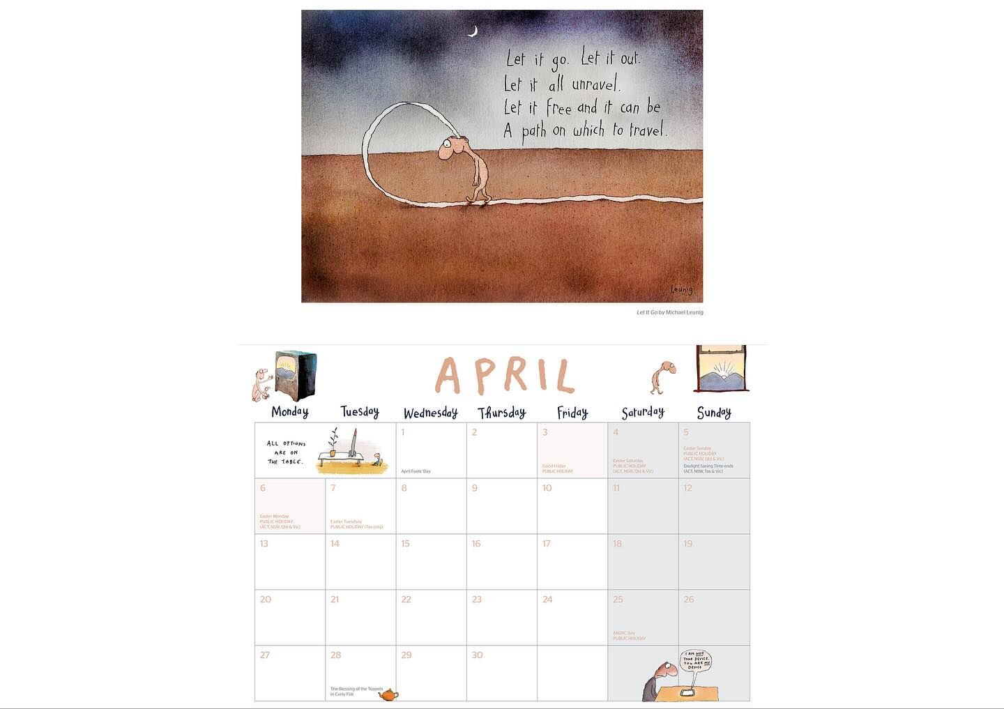 The 2026 Leunig Calendar featuring new works and beloved classics that carry Leunig's unmistakable voice. Each month offers thoughtful reflections celebrating life’s tenderness, humour, and mystery. A timeless companion for the year ahead and the first released since his passing.