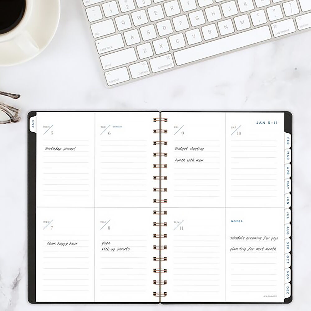 The AT-A-GLANCE Signature planner range offers unique gender-neutral cover materials paired with antique bronze twin wire binding to give a sophisticated look. Featuring stylish embossed and foil-printed covers with stitched edges to add an elegant look.