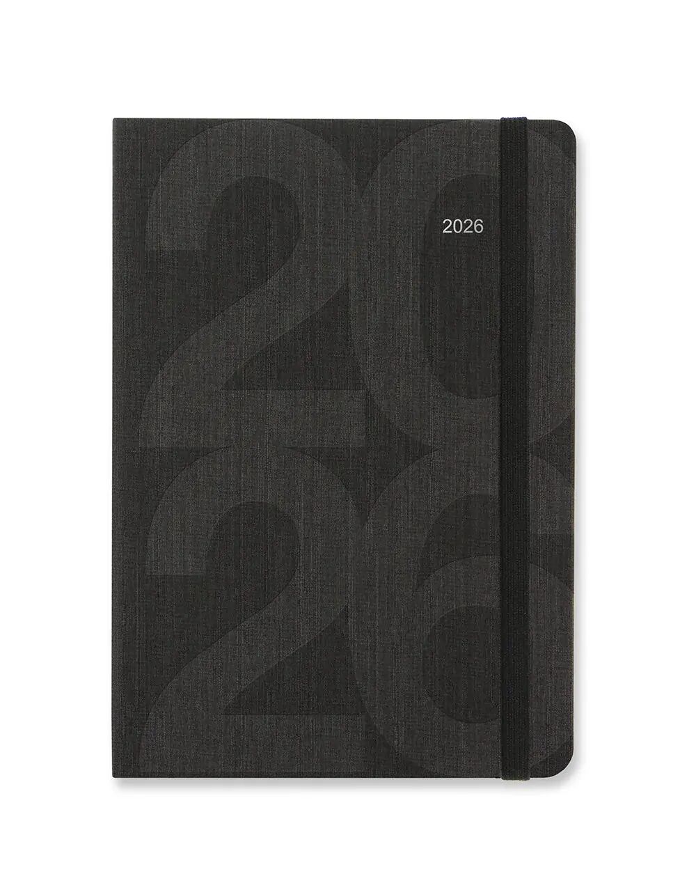 A classic with a twist; this hard case bound diary includes a sophisticated linen-textured cover, with a subtle blind debossed and silver foil date motif.