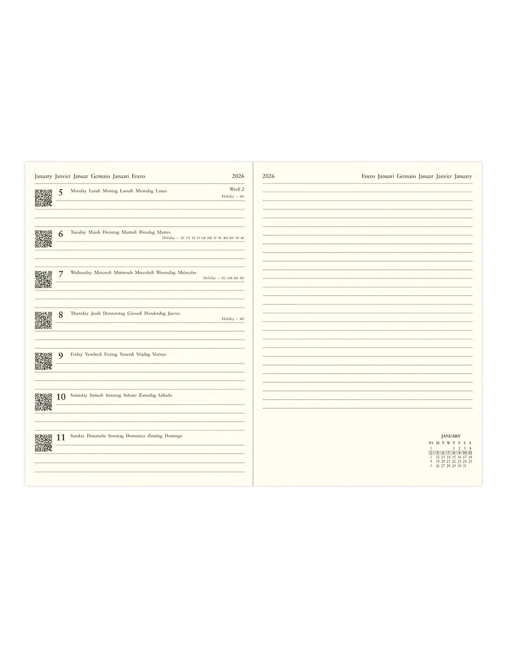 Minimal and practical. Choose between faux-leather, soft-touch or microtexture covers, all featuring our unique flexible spine construction, embossed date detail and coordinating elastic closure.