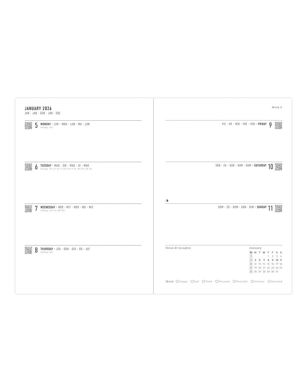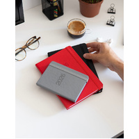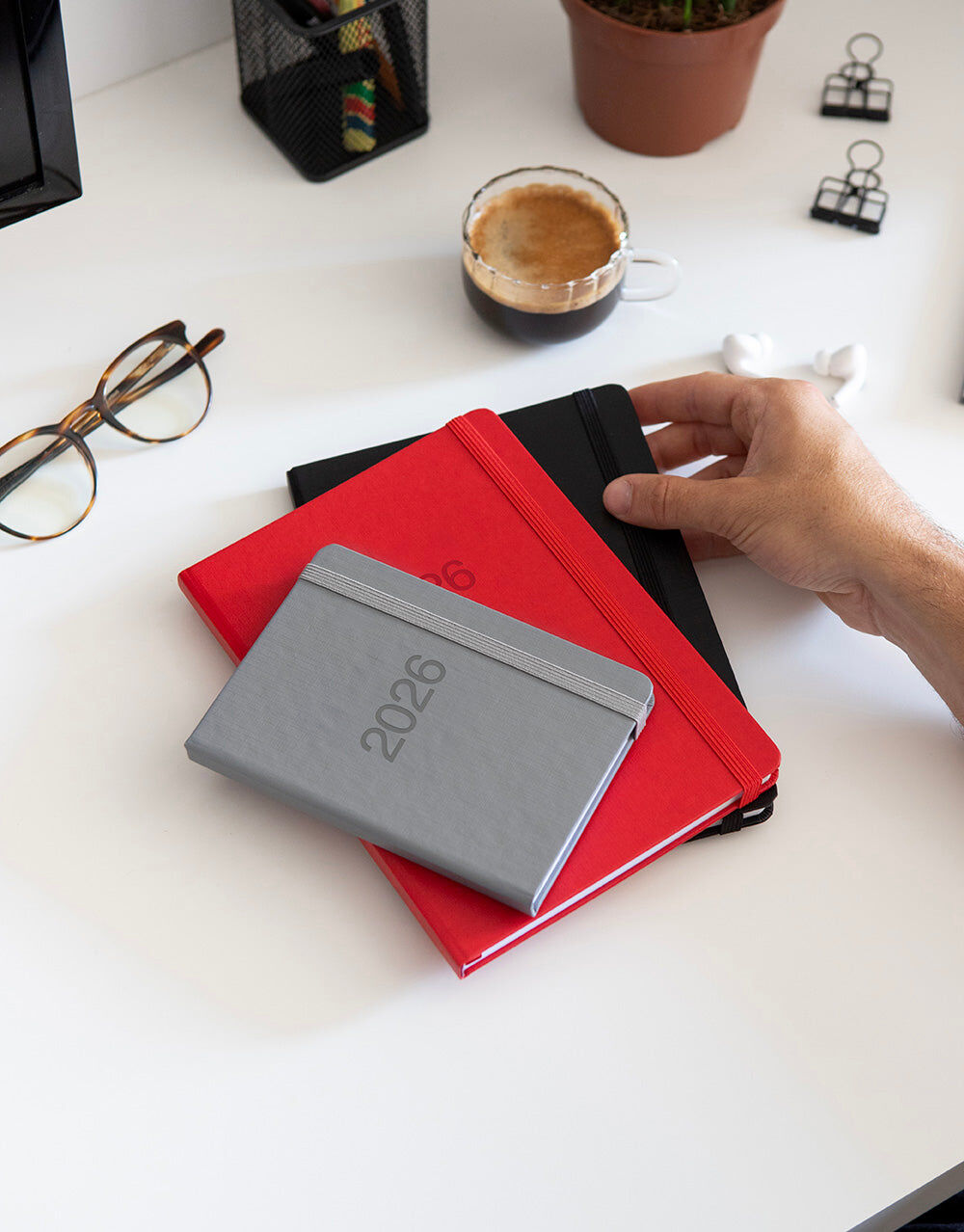 A cross-hatch textured diary collection, with the date embossed on the cover and a practical elastic closure for storing notes with ease.