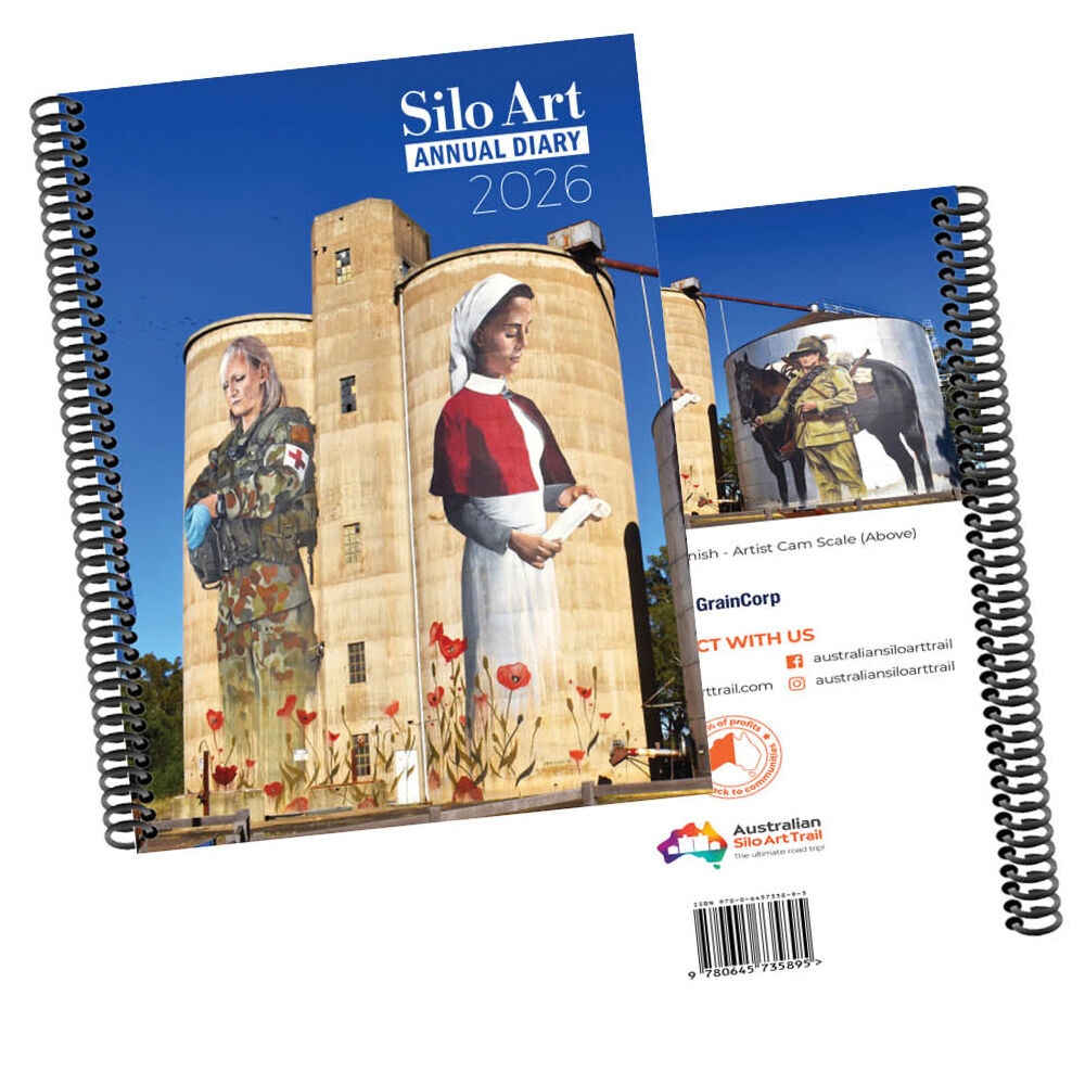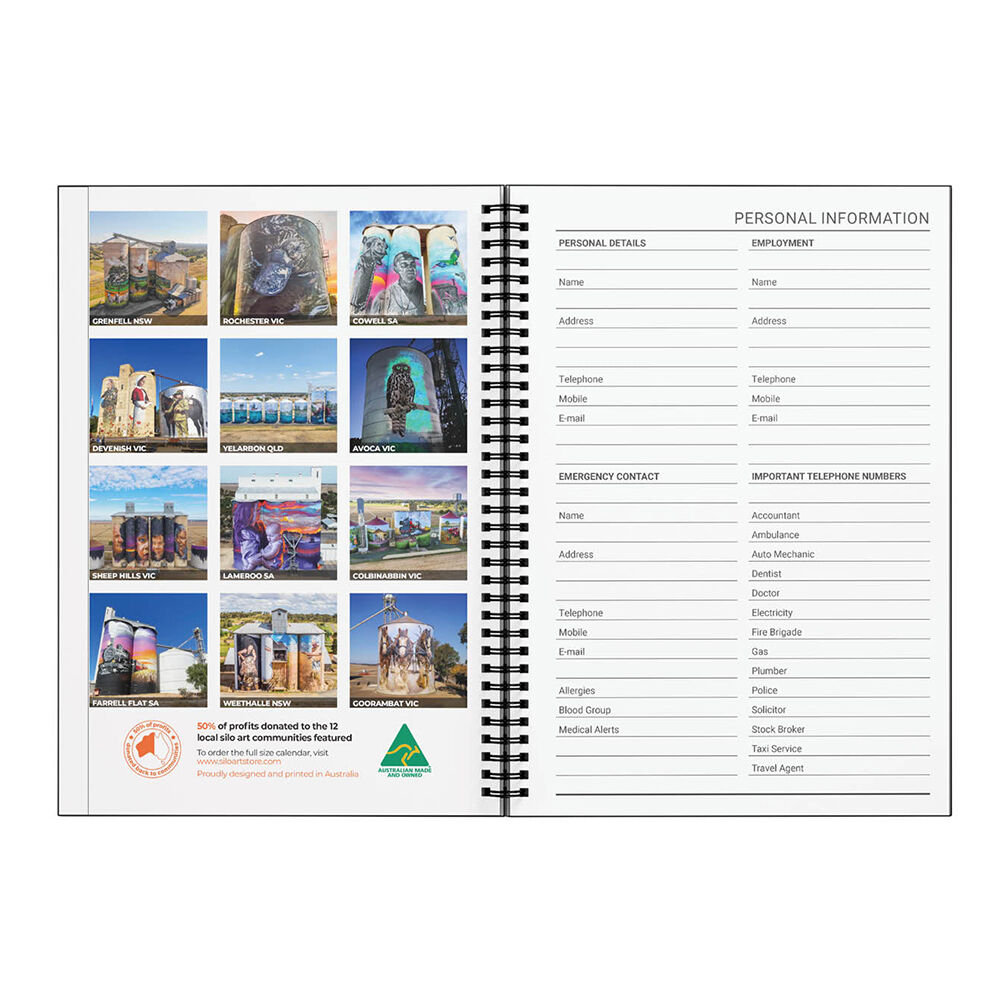 Introducing the perfect companion to organise your life and boost your productivity, the Silo Art Diary, featuring 12 of the 76 silo art murals from around the Country, is designed for personal and work use. By purchasing this diary, you contribute to meaningful support for these small towns, making a world of difference in their lives.