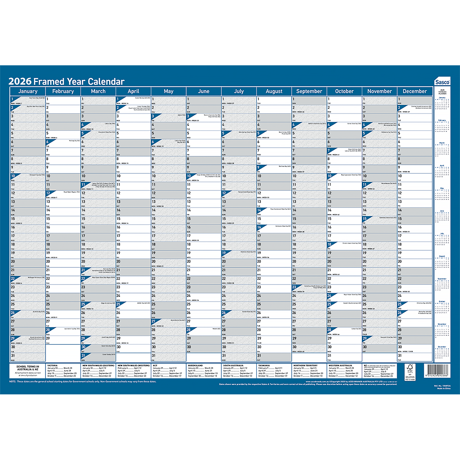 Sasco have been helping Australia and New Zealand plan for over 30 years. Over this time, Sasco have built a complete range from small Compact Planners to heavy duty Framed Wall Planners. For those serious about planning, Sasco has a wall planner for you. All products are FSC certified, using materials that are sourced responsibly while still supplying a great quality product you can rely on for all your planning needs. All planners include Australian and New Zealand Holidays.