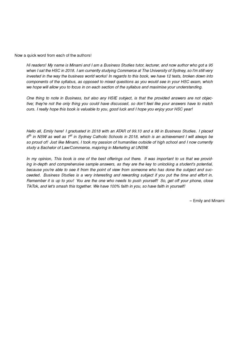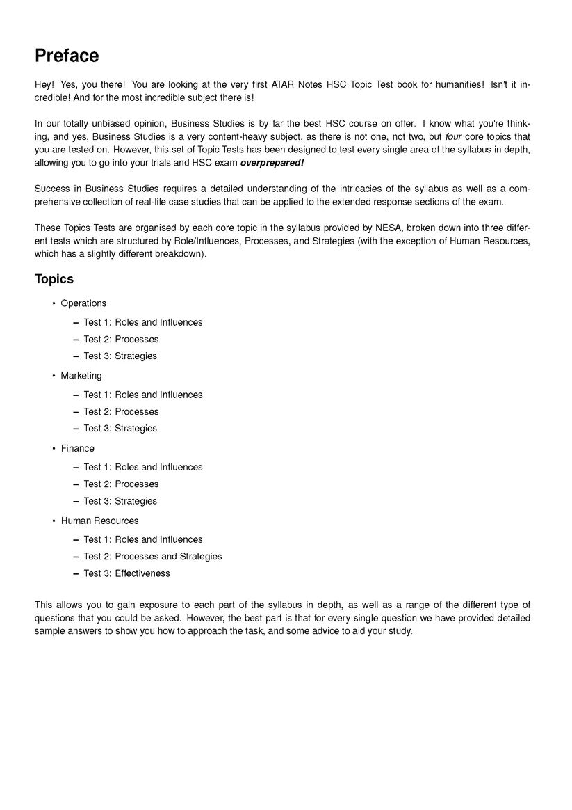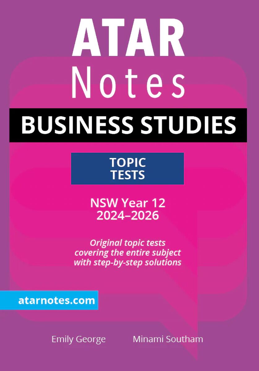 Our HSC Year 12 Business Studies Topic Tests are the best assessment resource you could ask for. This book contains original exam-style questions covering all four topics. Most importantly, each question comes with a detailed solution at the back of the book, showing you exactly what you need to write to attain full marks, as well as advice from two past high-achieving students to help you refine both your knowledge and your test-taking skills.
