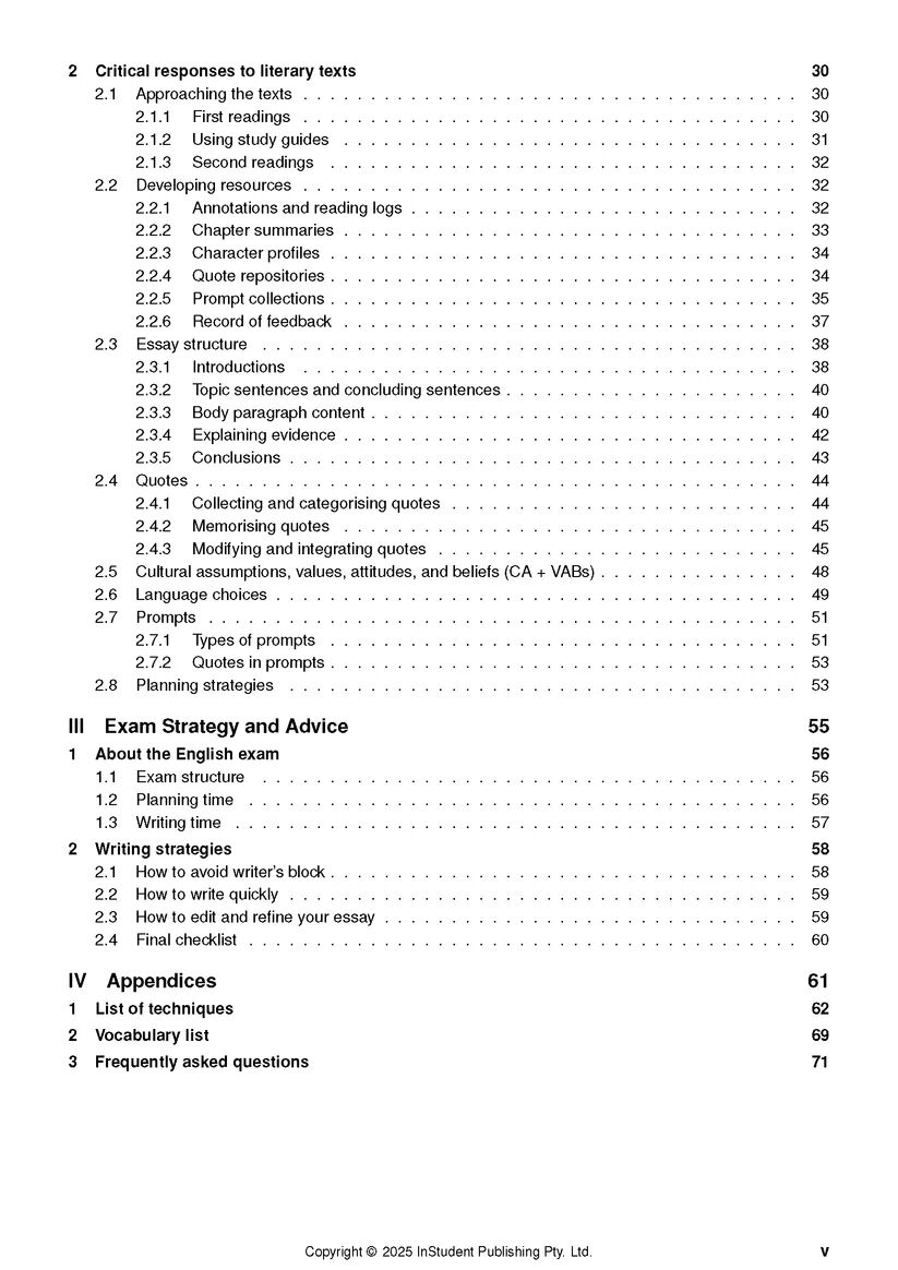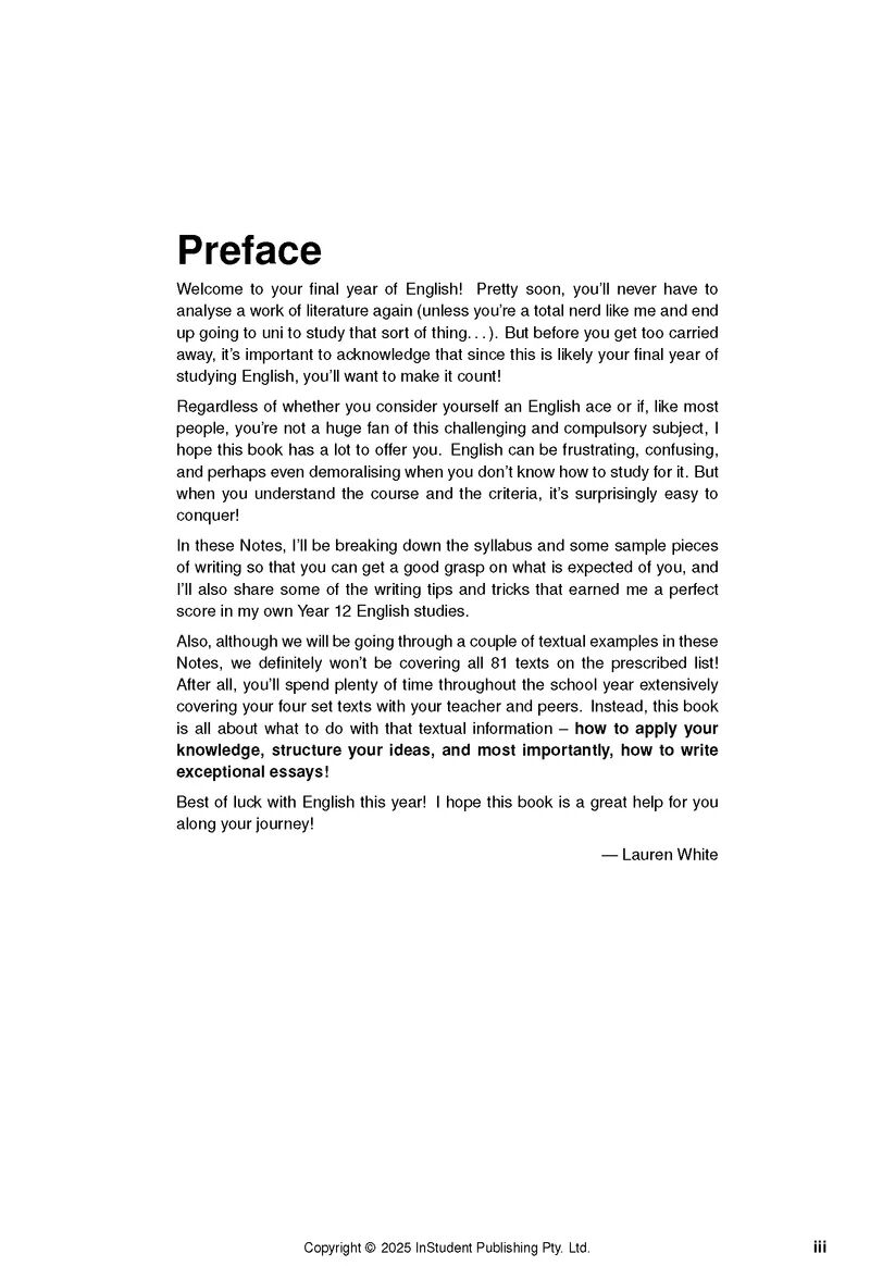 This book will guide you through the entire QCE English course, with detailed advice for each topic including how best to prepare for assessment tasks and exams. There are also sample essays, paragraphs, and sentence templates for you to use, clear explanations of the assessment criteria, and countless tips to boost your English performance so you can feel more confident in your writing.