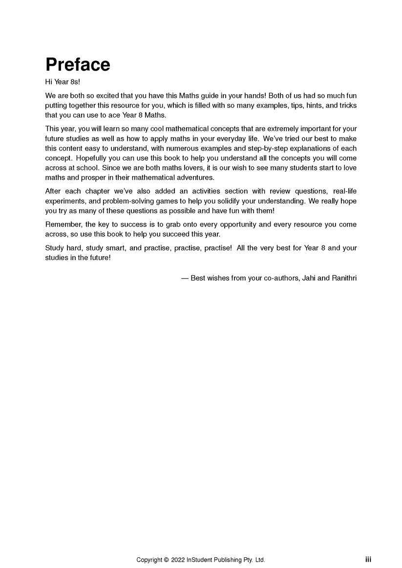This fun, interactive guide to the Year 8 Maths course is the perfect tool to help you learn and perfect the important skills covered in the Australian National Curriculum. From percentages and measurement to complex algebra and statistics questions, everything in this guide is written in an engaging and student-focused way, just like a tutoring session! With plenty of activities and worked examples, these Notes will give you the confidence to succeed in Year 8 and beyond.