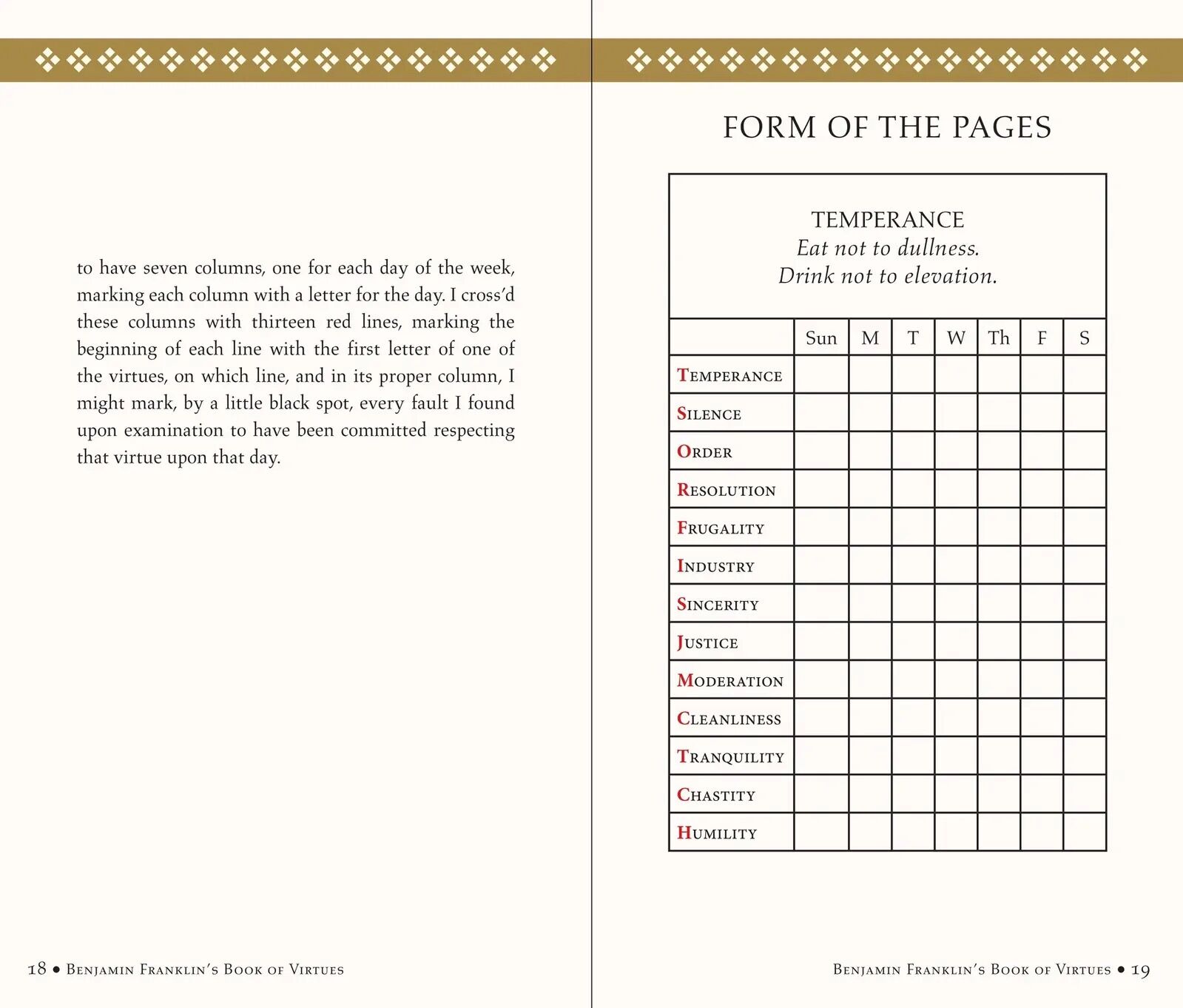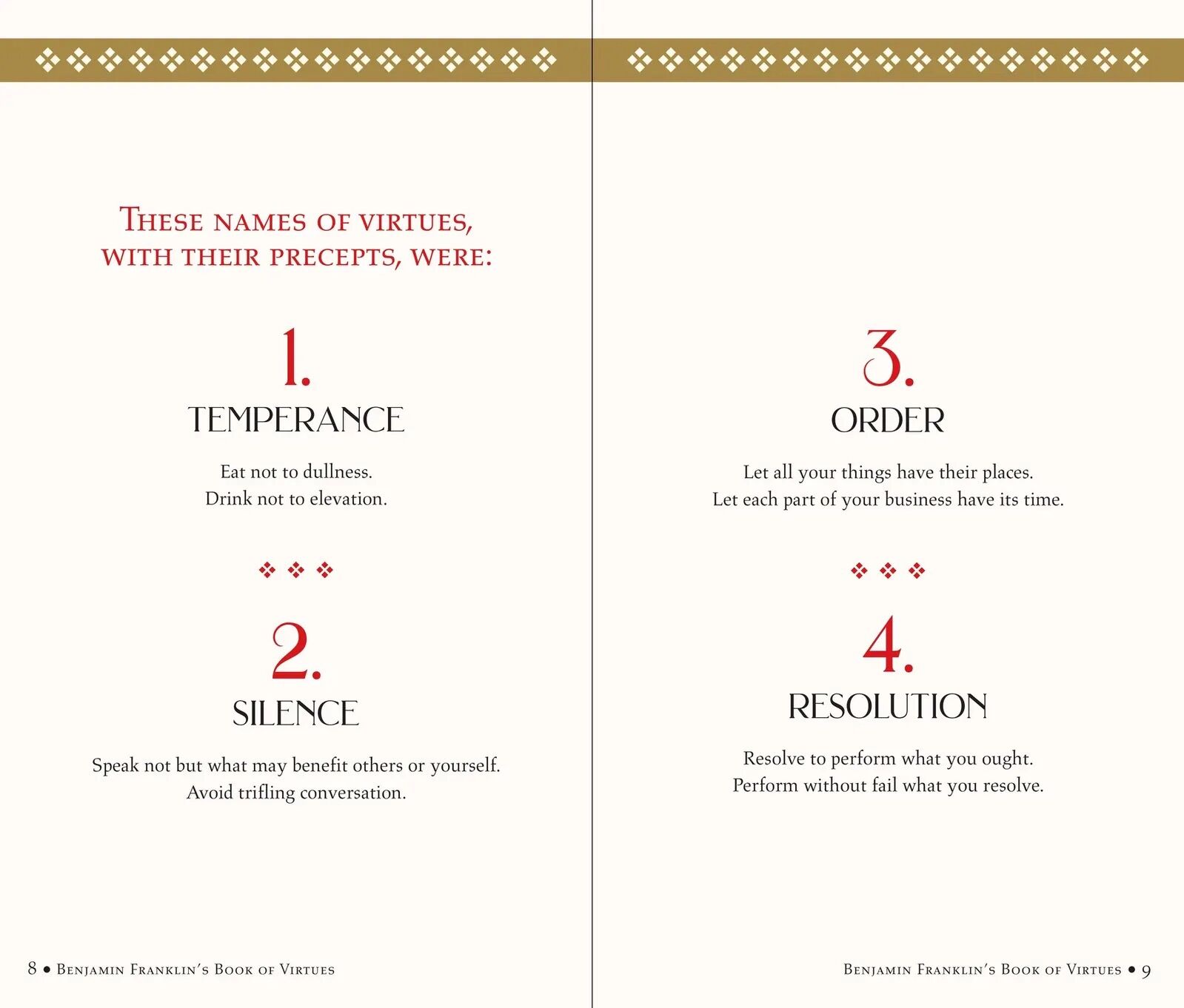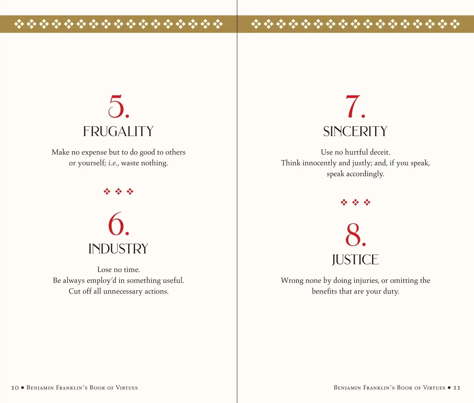 Elegant keepsake volume presents Ben Franklin's list of 13 essential virtues, including resolution, industry, and justice, and a plan for putting them into practice. Franklin intended his list to serve as a template for self-improvement and success in life.
