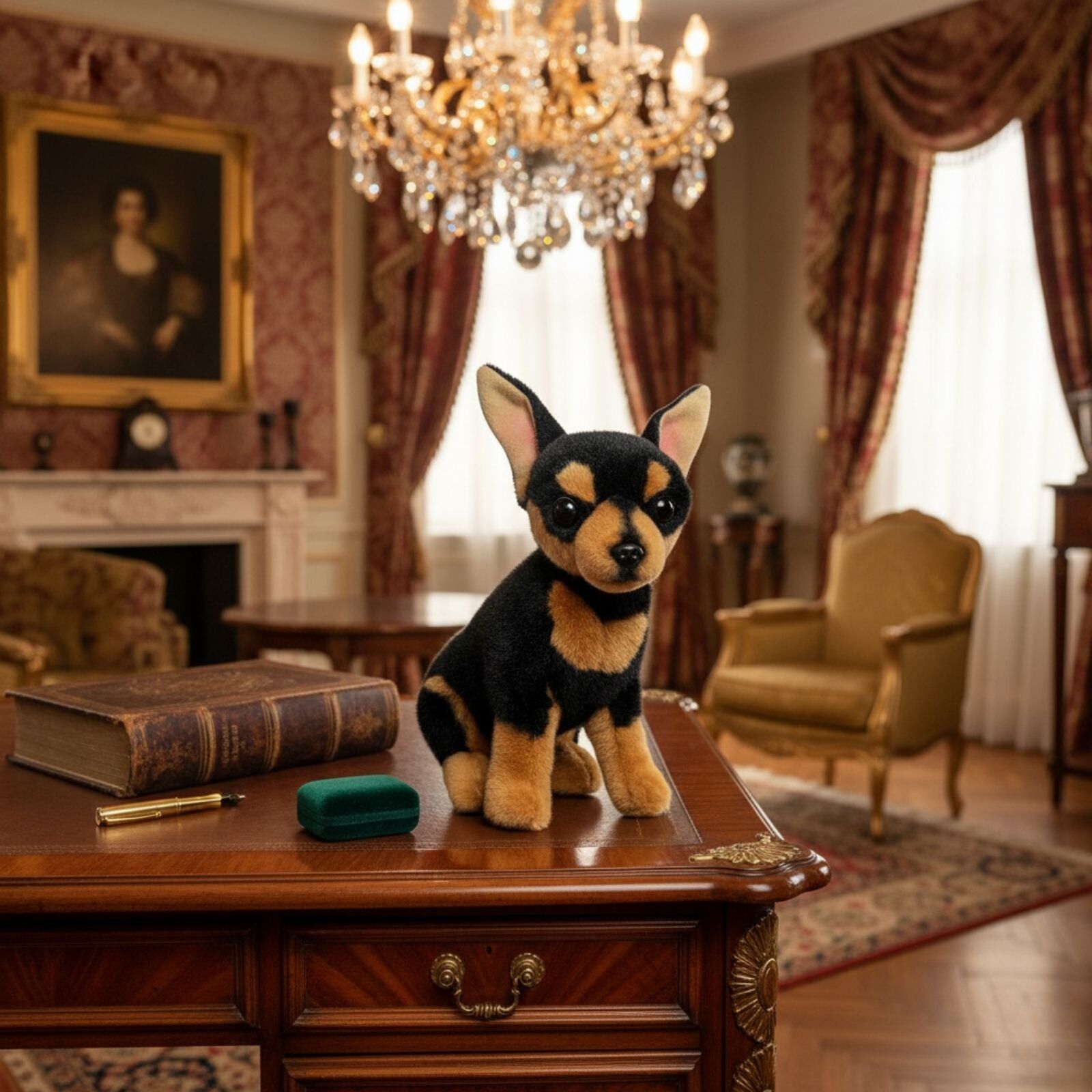Taco is a really cute realistic stuffed plush Chihuahua dog in black and tan, he is a quality-made plushie in a sitting position.