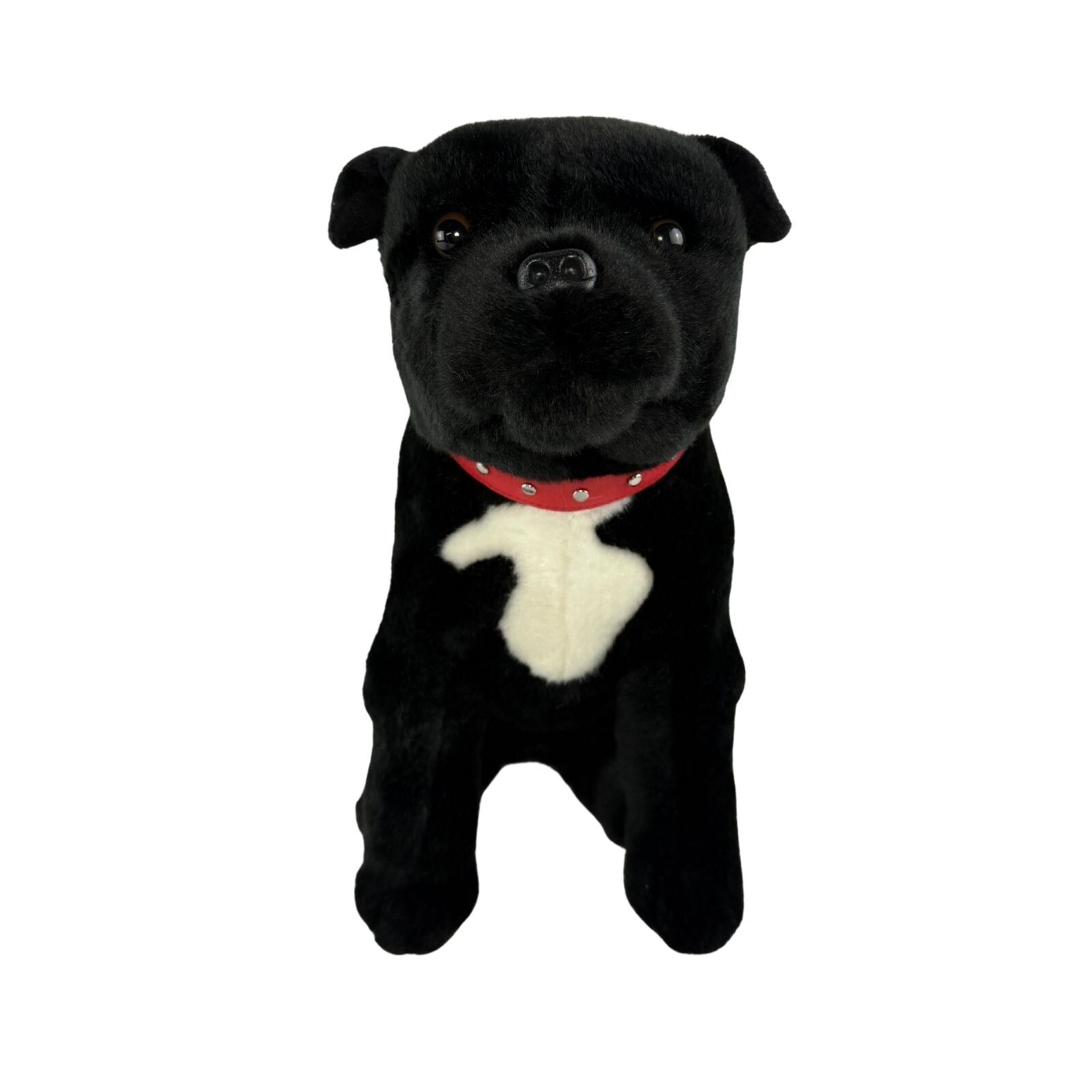 DJ is an exquisitely soft and realistic handcrafted Black Staffordshire Bull Terrier plush toy, stuffed animal.