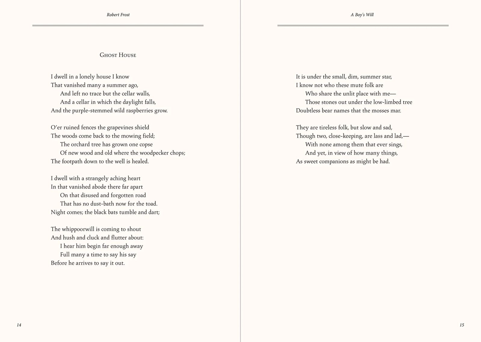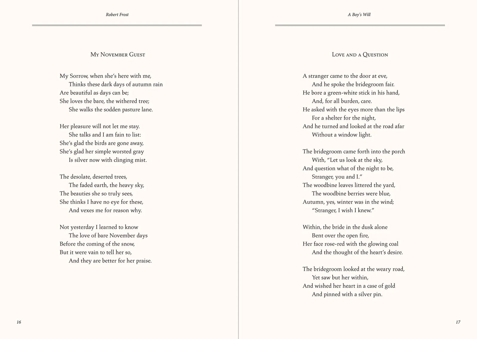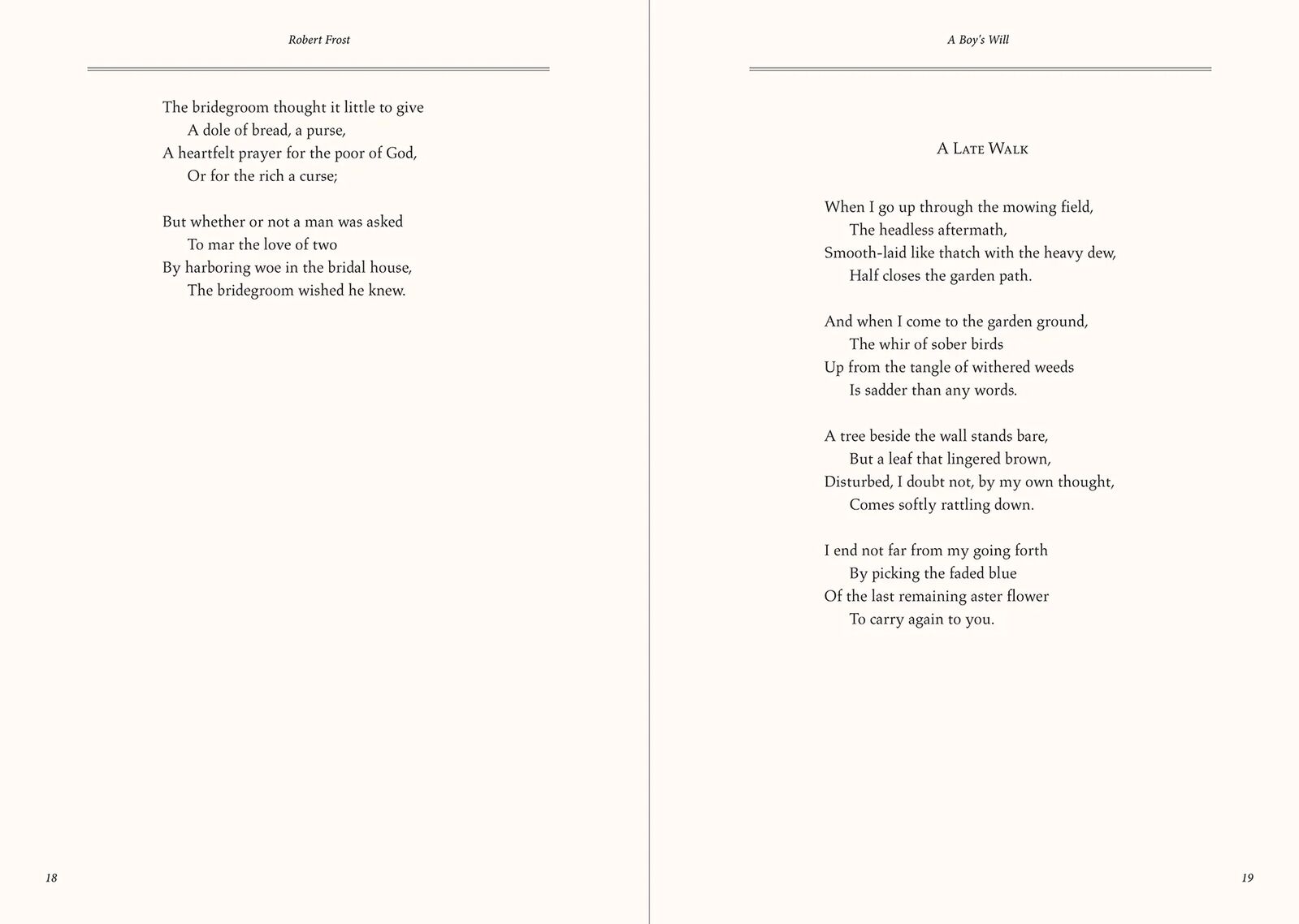 Read Robert Frost's first five poetry collections in one stunning volume. Frost's poems are remembered for their musicality, direct language, moving images, and ability to inspire introspection and awe. The elegant Masterpiece Library Edition collection honours the Peter Pauper Press founders' tradition of publishing beautiful books.