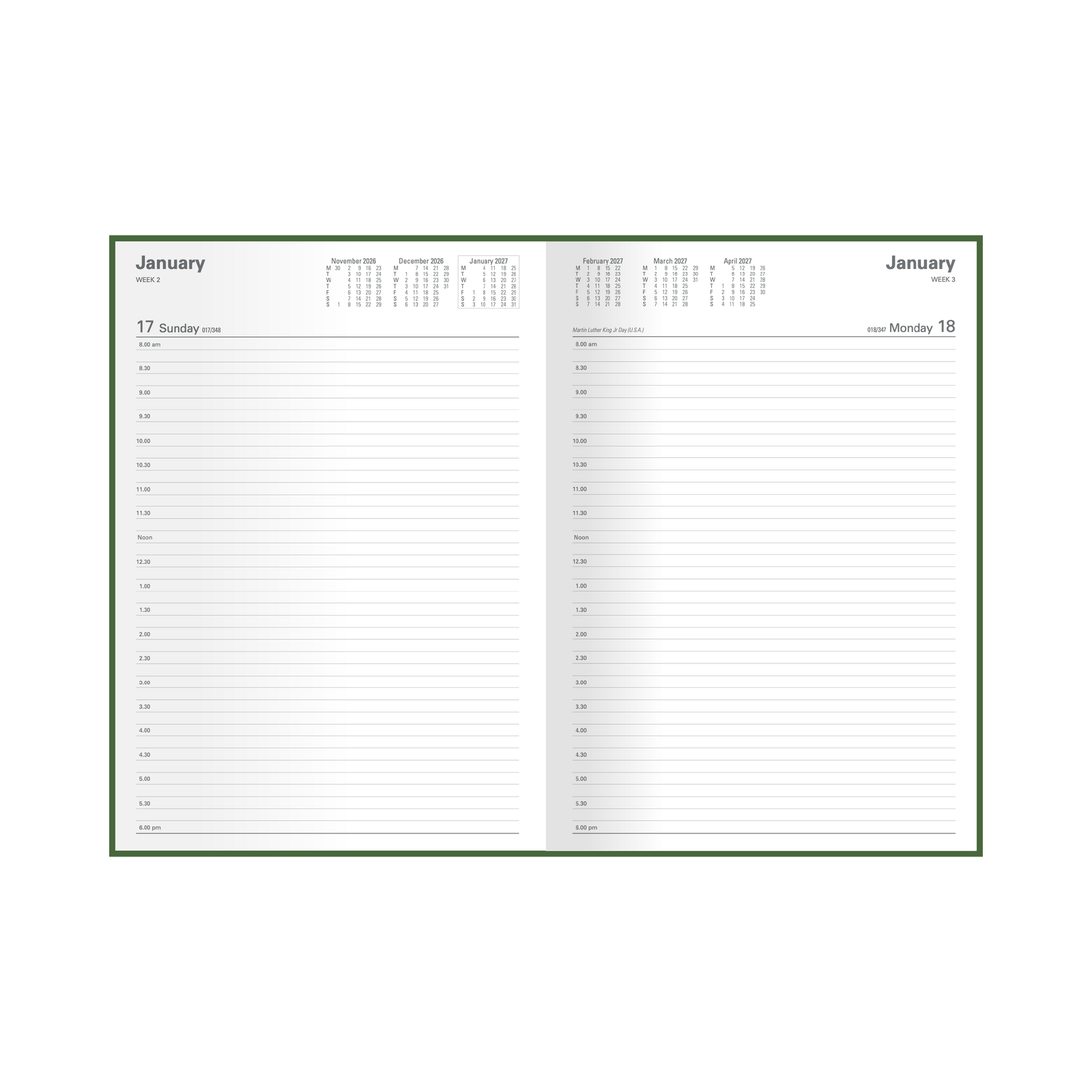- Format: Day to Page (8am to 6pm, 1/2-hourly)