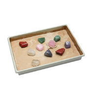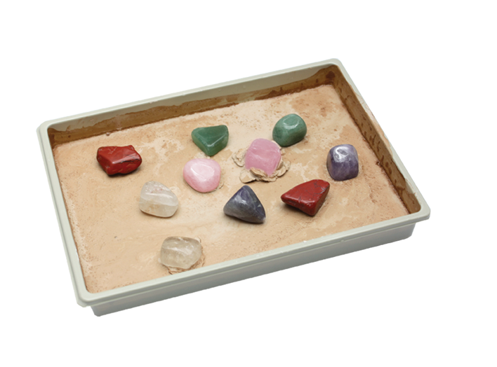 Excavate 10 gemstones from the block to discover 5 different types of tumbled gemstones, including: Aventurine, Quartz, Rose Quartz, Amethyst and Red Jasper. Excavading tools included.