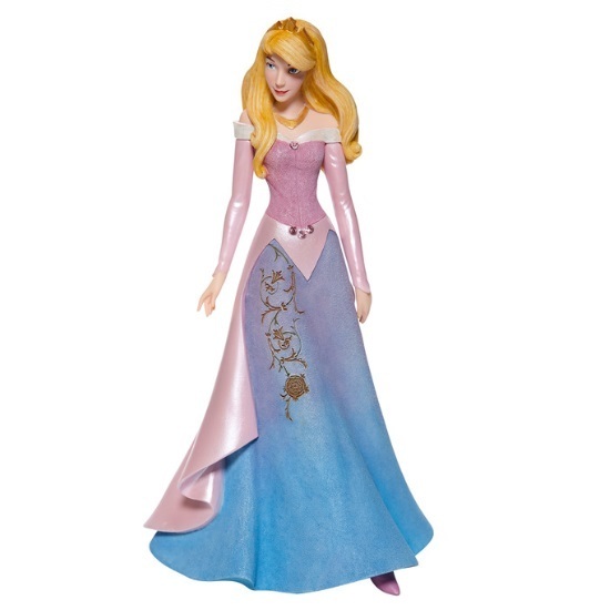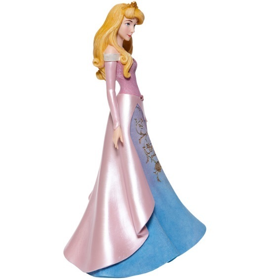 Princess Aurora from Sleeping Beauty showcases her vibrant couture with velvet and satin finishes and metallic gold accents. Part of the Disney Couture de Force collection from Enesco.