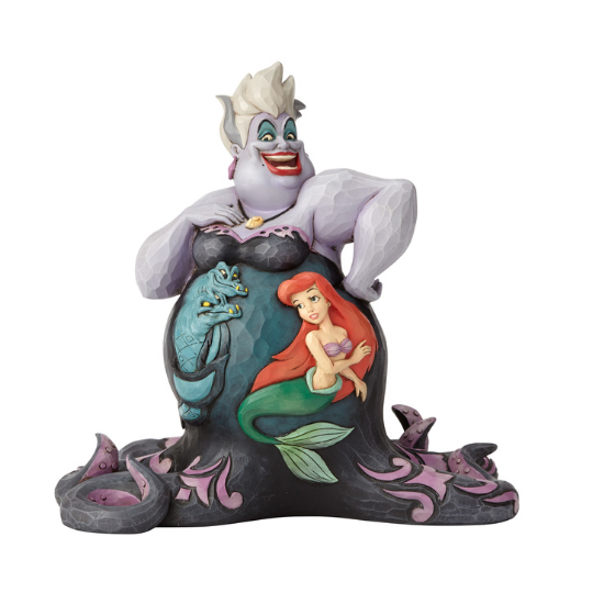 Jim Shore captures the larger-than-life personality of Ursula in this handcrafted design. The theatrical villain's voluptuous octopus figure is sculpted from stone resin and carefully hand-painted. Ursula and her evil side-kick eels, Flotsam and Jetsam make their debut into the Disney Traditions collection. Jim Shore has used relief artwork on the body of Ursula to depict the moment the Little Mermaid meets the evil sea queen's minions, with the princess seen glimpsing back over her shoulder at the gruesome twosome.
