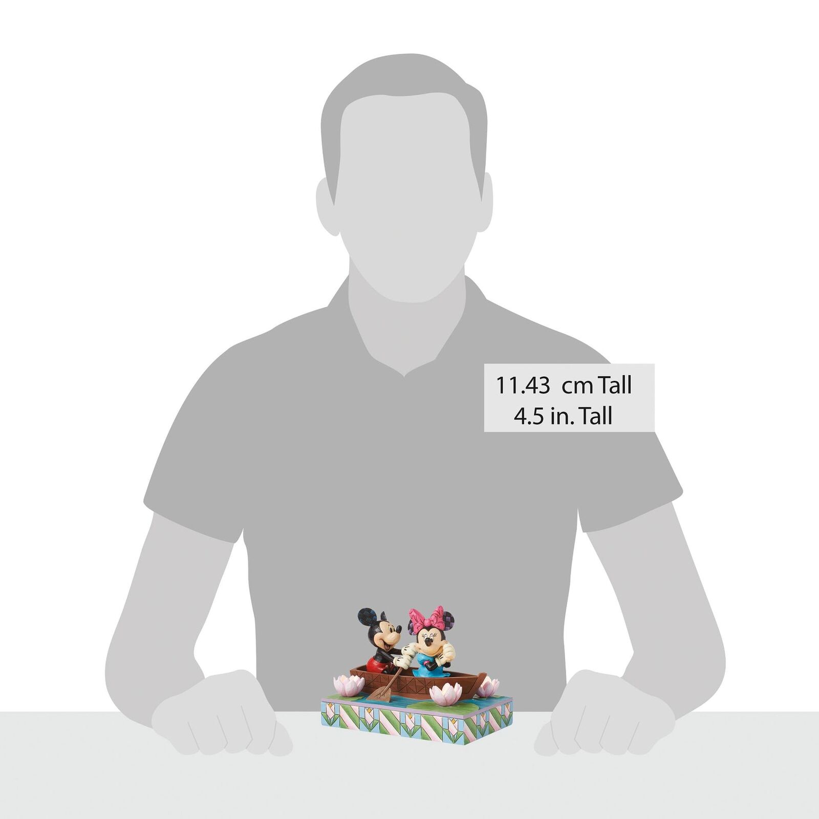 Jim Shore creates a romantic scene of beloved characters, Mickey and Minnie Mouse aboard a quaint rowboat bathed in the glow of tranquility. Amidst the serenity of nature, blooming flowers adorn their river rendezvous as the two love birds float on.
