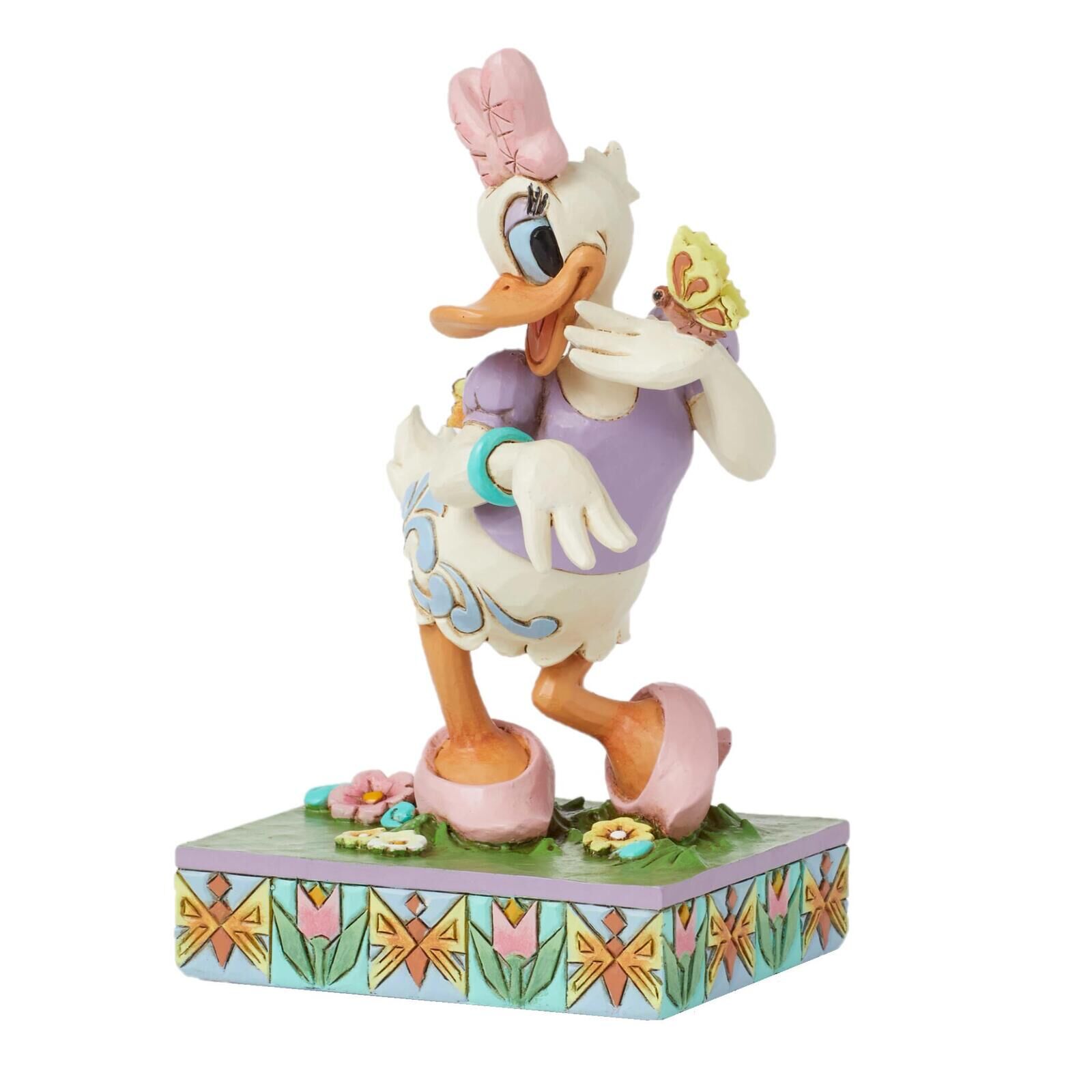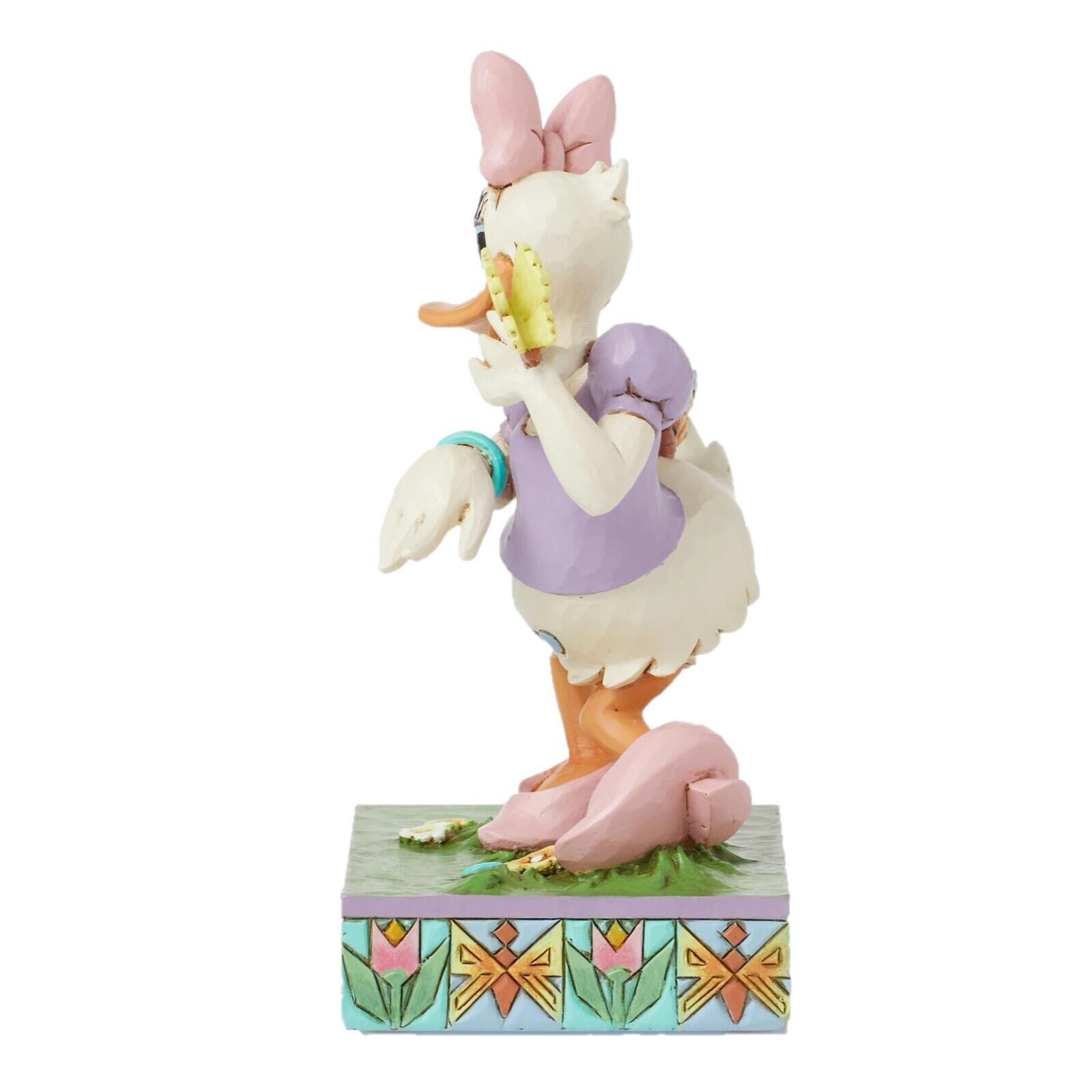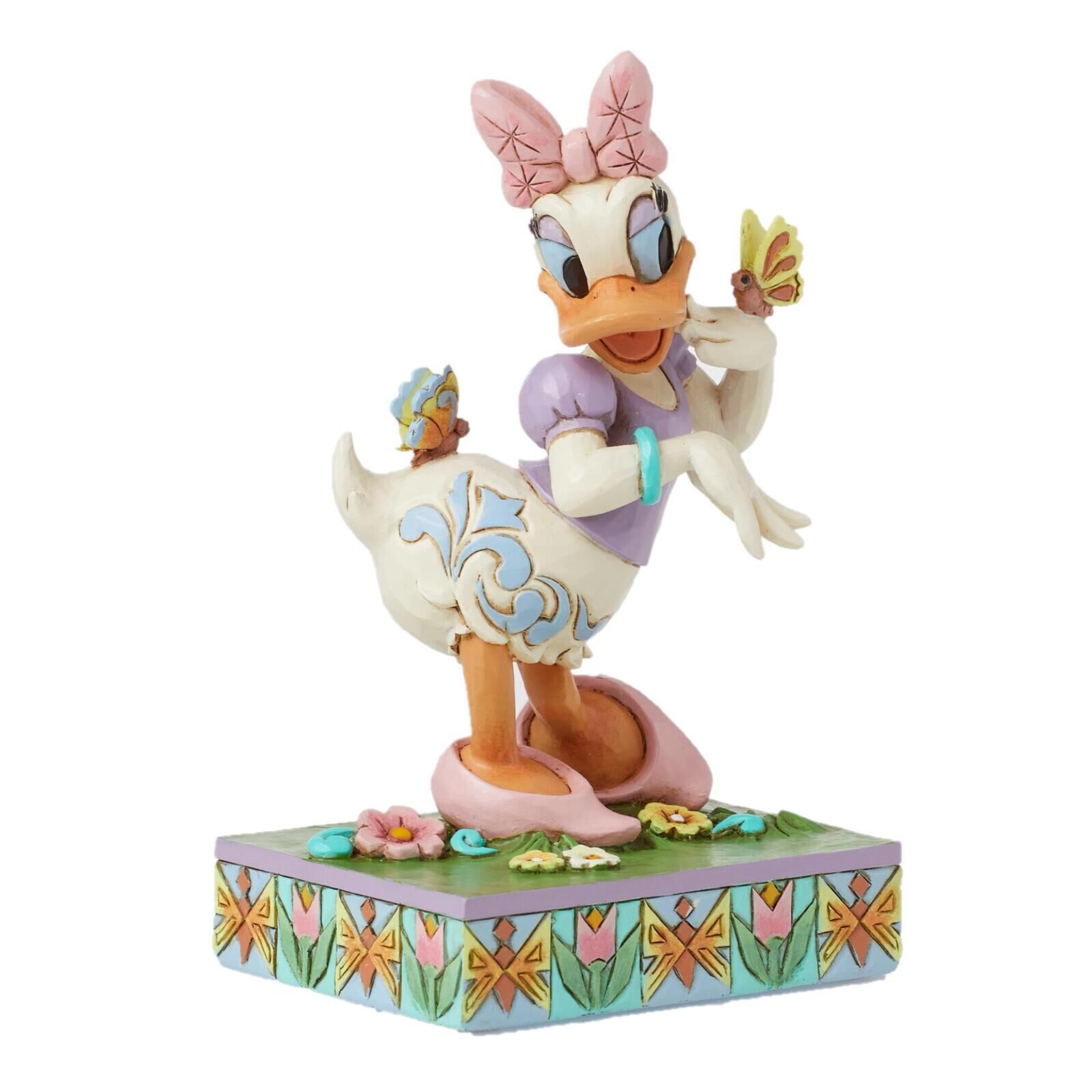 Step into the splendor of spring with this breathtaking Jim Shore figurine of Disney's beloved character, Daisy Duck. Daisy stands in awe on a stage of kaleidoscopic flowers blooming in season as delicate butterflies flutter and land beside her.