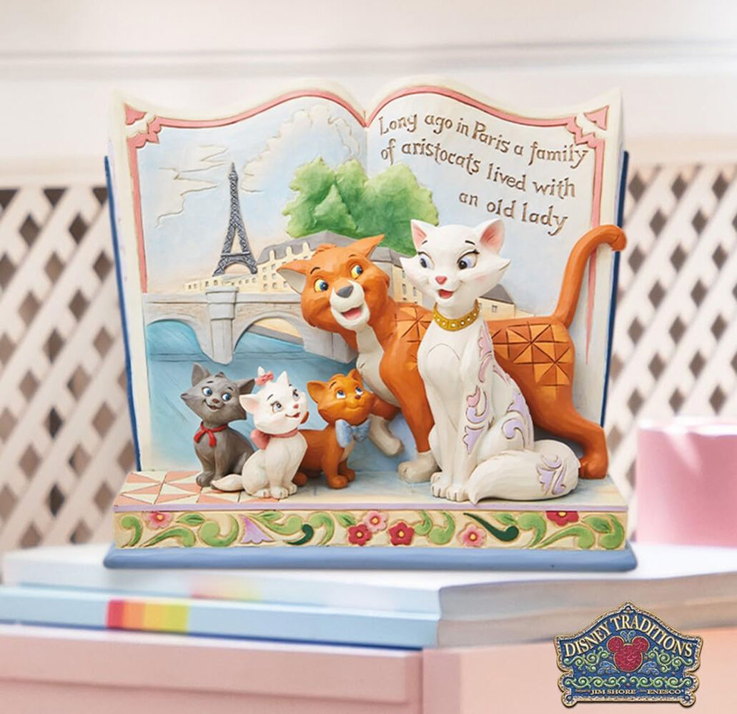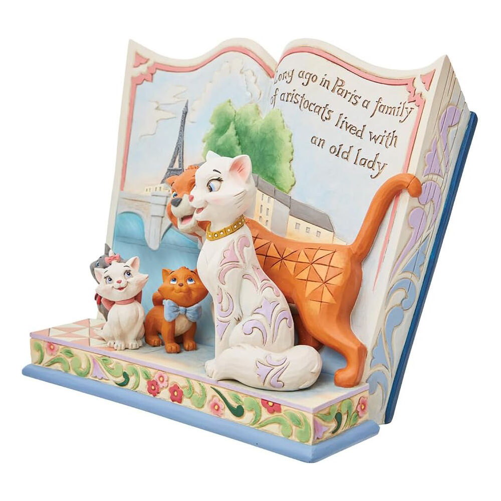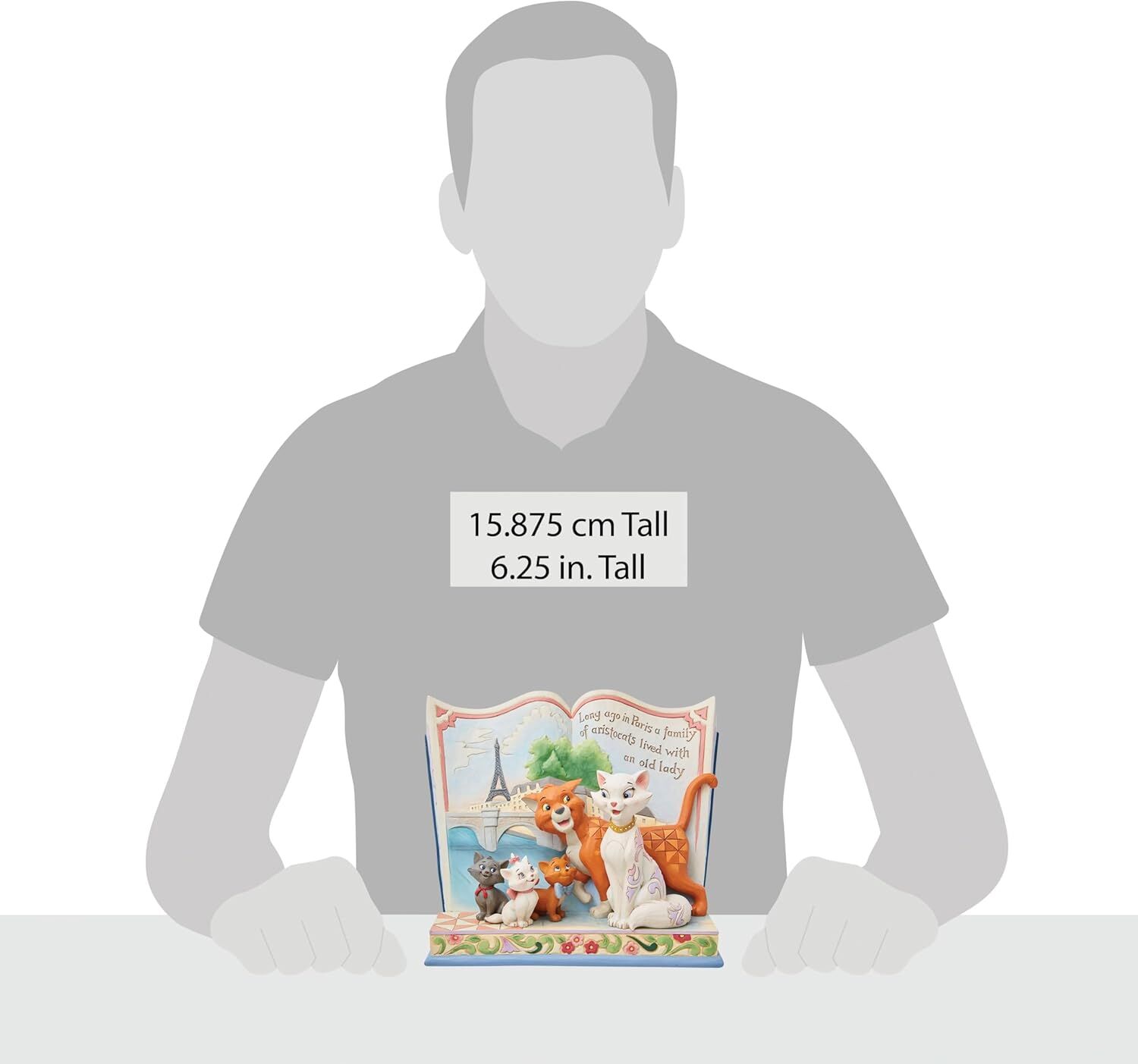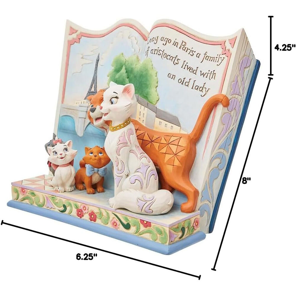 Bring home a piece of Disney magic with this enchanting collectible figurine, an artful tribute to The Aristocats, crafted by renowned artist Jim Shore. The figurine is designed to resemble an open storybook: behind the characters, the pages form a backdrop depicting a scenic Paris view, complete with the inscription "Long ago in Paris a family of aristocats lived with an old lady.", evoking nostalgia and the fairy-tale heart of the film.