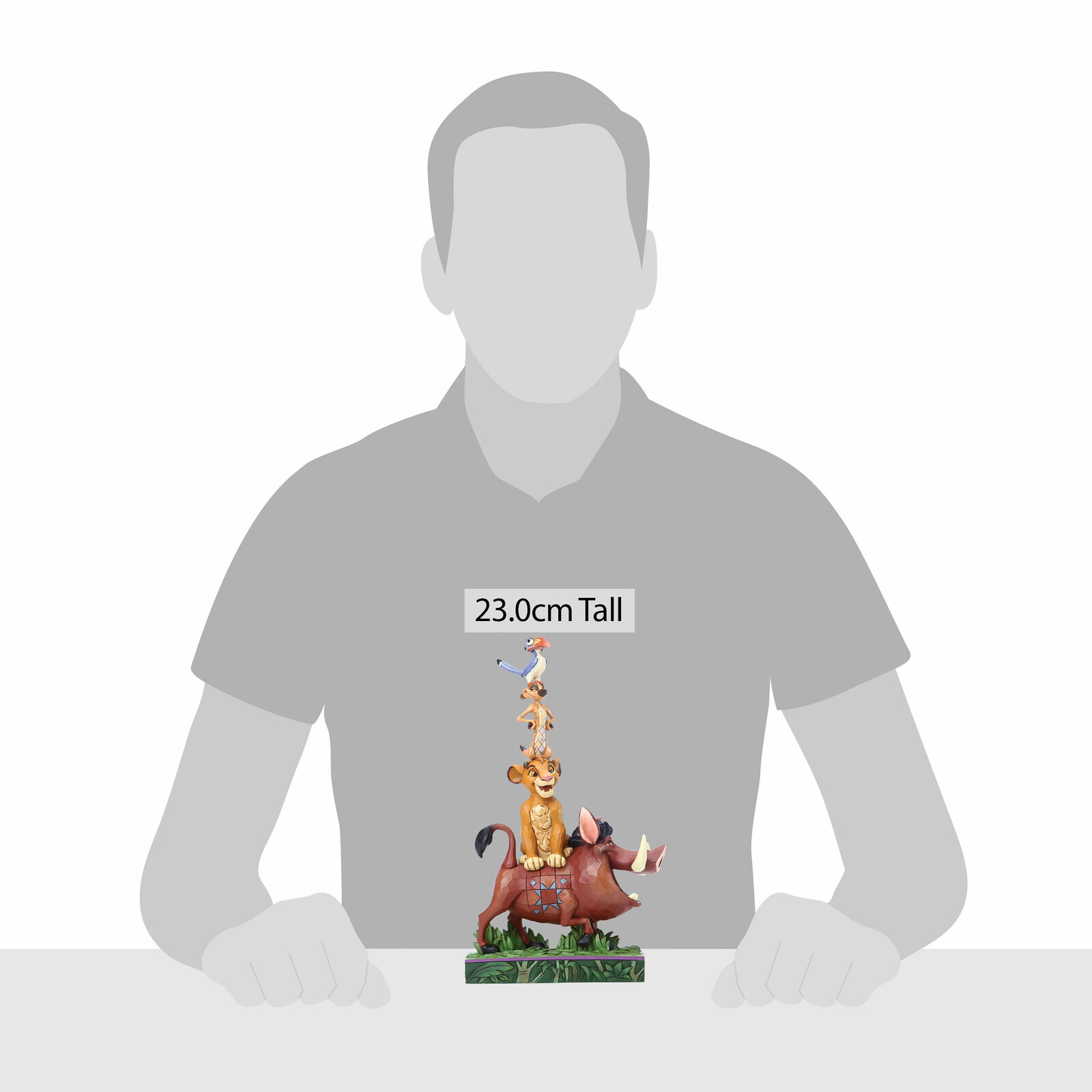 Jim Shore's unmistakable style combines classic Disney characters with designs inspired by folk art forms of quilting, rosemaling and tole painting. Simba just can't wait to be king, mimicking the classic musical scene from The Lion King, Pumba, Simba, Timon, and Zazu create a towering stack of friends. In classic Jim Shore style, these four bear bright smiles, and each other, Balance of Nature's weight.