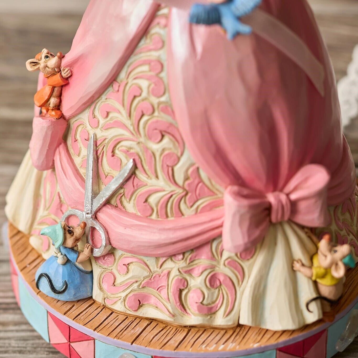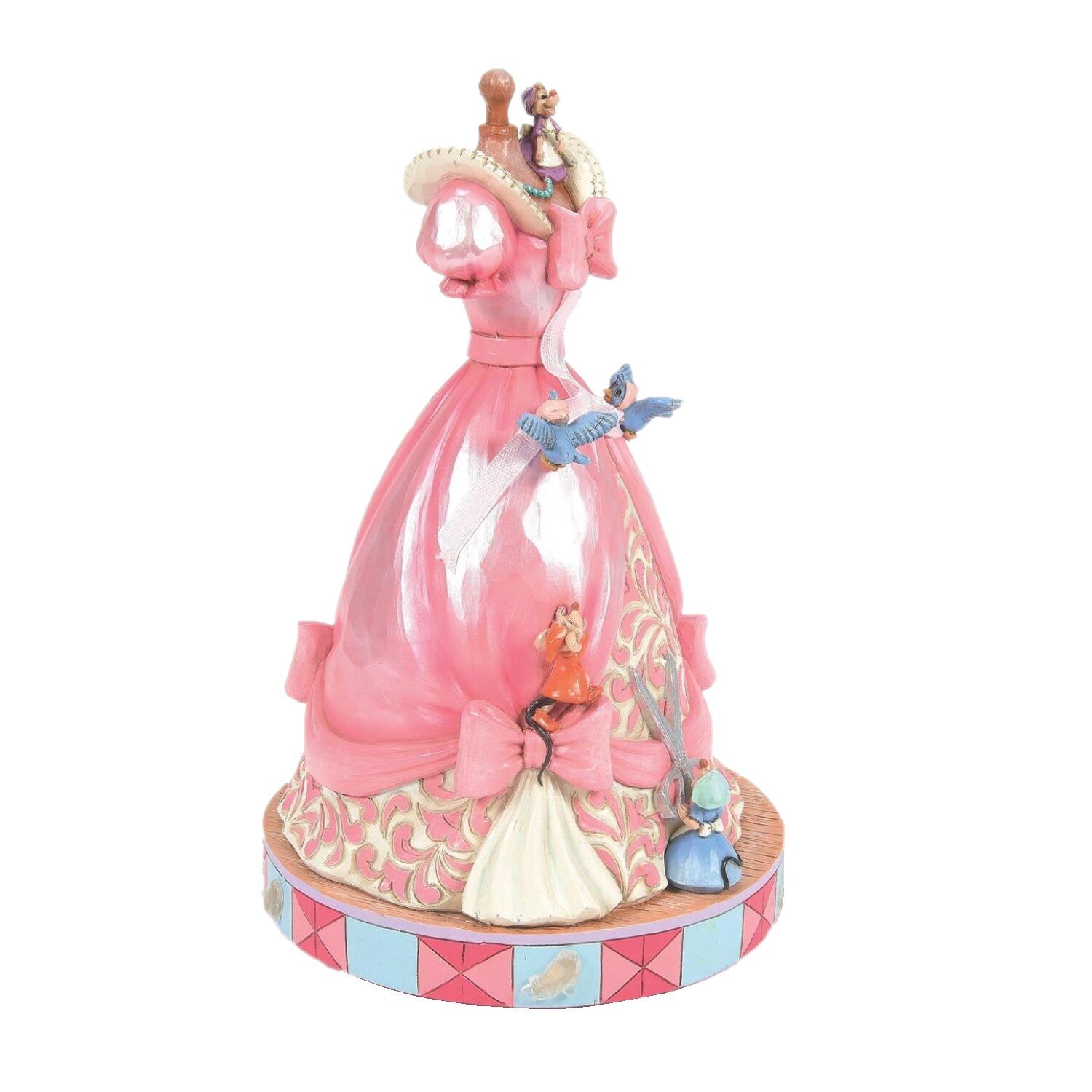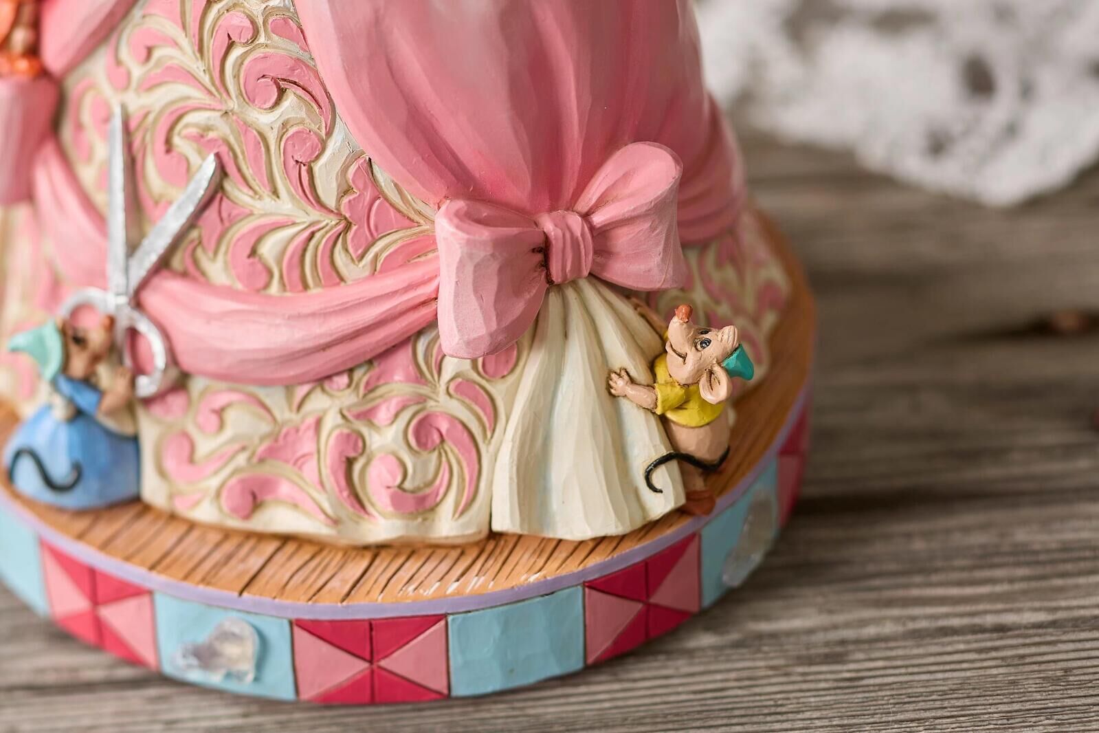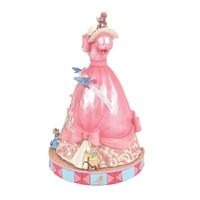 Delight in the timeless magic of friendship and transformation found in the Cinderella story with this unique Jim Shore piece. Playing A Dream is a Wish Your Heart Makes , Cinderella's dress is lovingly crafted by her bird and mouse companions.