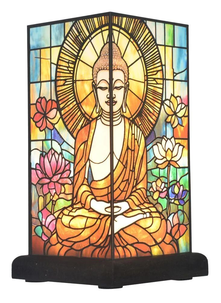 Create a calming atmosphere with this Buddha stained glass lamp. Its warm glow and intricate design bring serenity and spiritual charm to any room. Perfect for living rooms, the intricate stained pattern brings a touch of craftsmanship to your decor. Both functional and decorative, it's ideal for anyone looking to blend lighting with artistry.