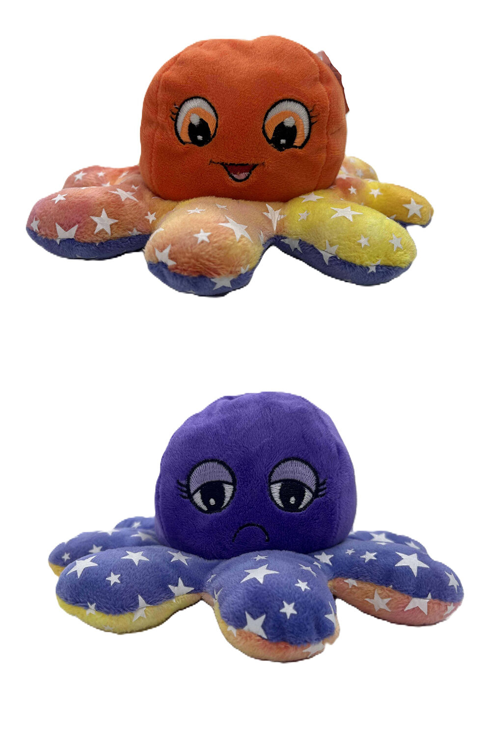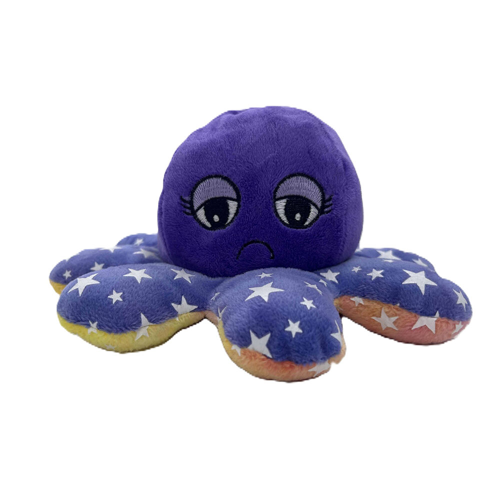But the fun doesn't stop there. Scattered across her plush body are glowing stars that light up in the dark, turning this little octopus into a magical friend when the lights go out. Whether you're feeling over the moon, or a little under the sea, this reversible plush Gemini octopus is ready to match your vibe.
