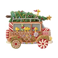 Brighten your holiday season with this playful Jim Shore design of Snoopy driving a festive gingerbread cookie van. Snoopy steers with joy as peppermint wheels spin, while Woodstock rides on the roof with a decorated Christmas tree in tow.