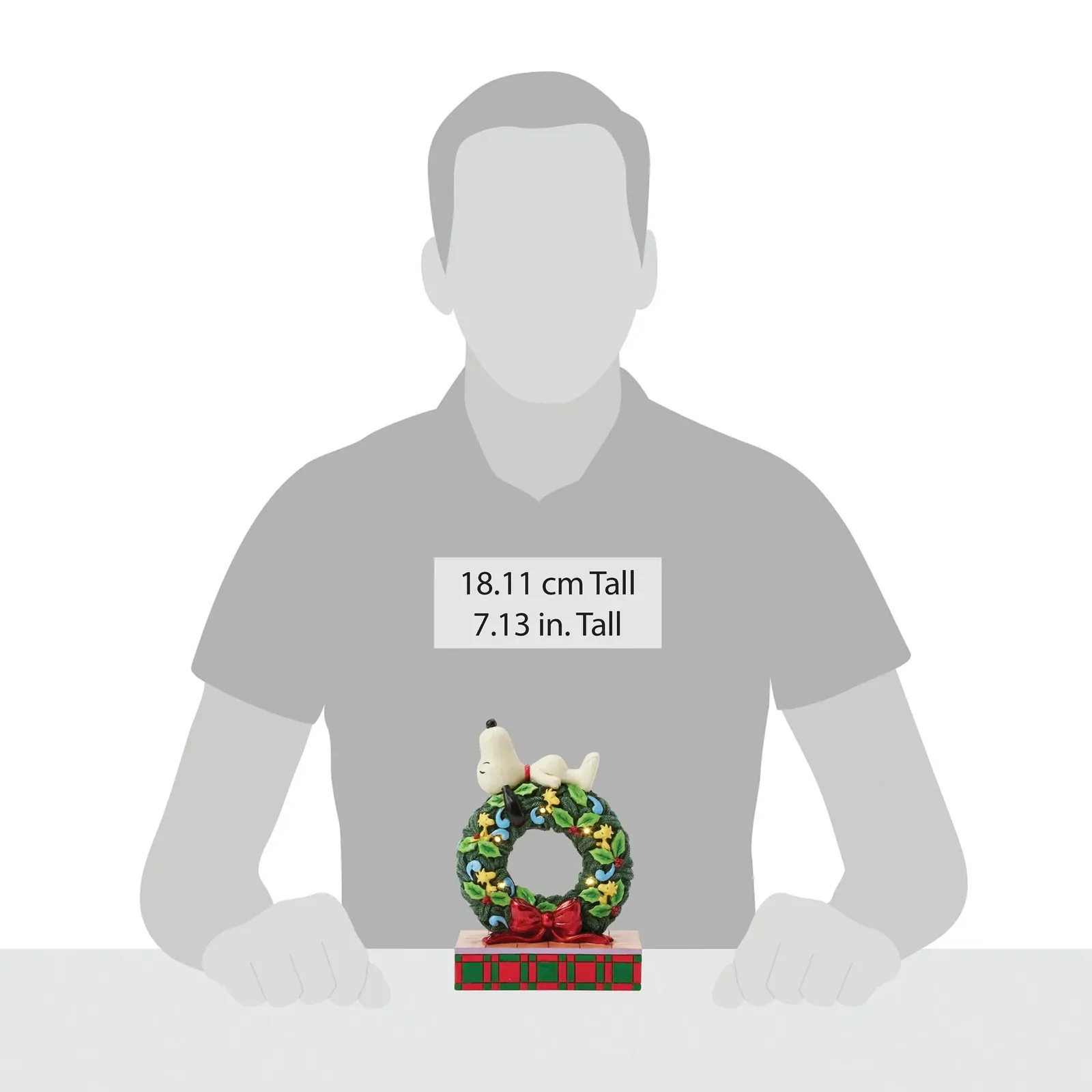 Add a touch of festive charm to your holiday decor with this delightful Jim Shore design of Snoopy peacefully snoozing atop a lush holiday wreath. The wreath, lovingly adorned by Woodstocks, adds a whimsical touch to your holiday home decor.