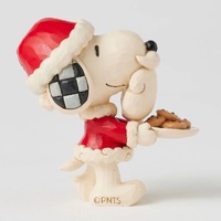 Add a playful touch to your holiday decor with this miniature Jim Shore design of Snoopy dressed as Santa, complete with a fake beard. Carrying a plate of fresh cookies, Snoopy spreads cheer with his joyful spirit and beloved Jim Shore details!