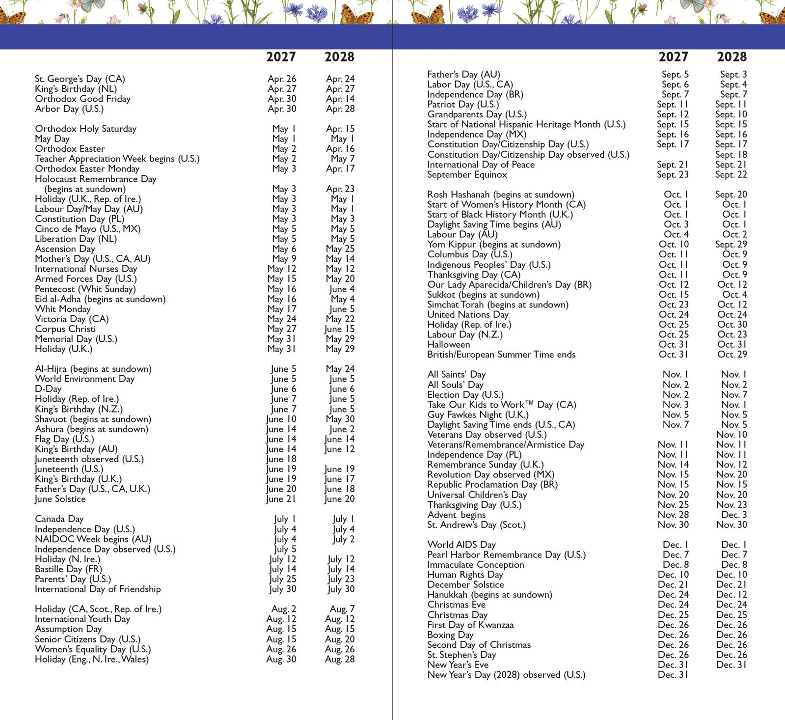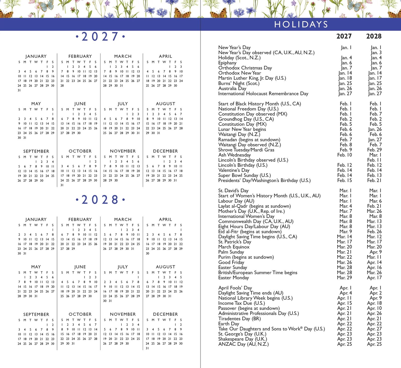 - Holidays, observances, and lunar phases are included.
