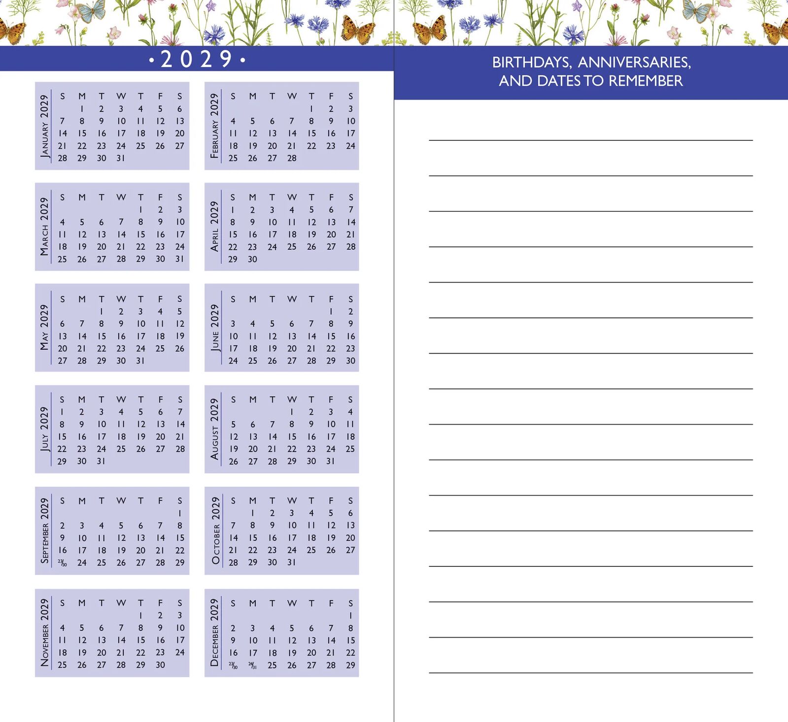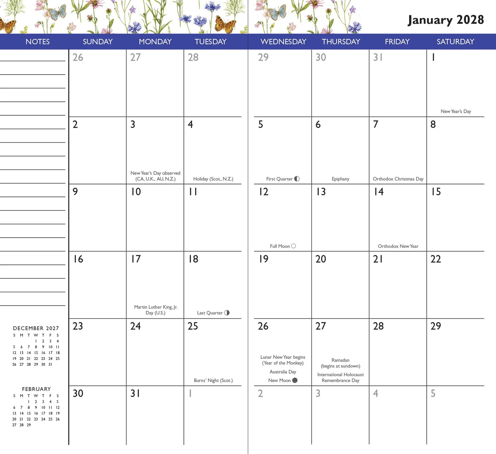 - Each monthly spread includes mini month reference calendars (1 for the month past, 1 for the month ahead), plus ruled space for making notes.