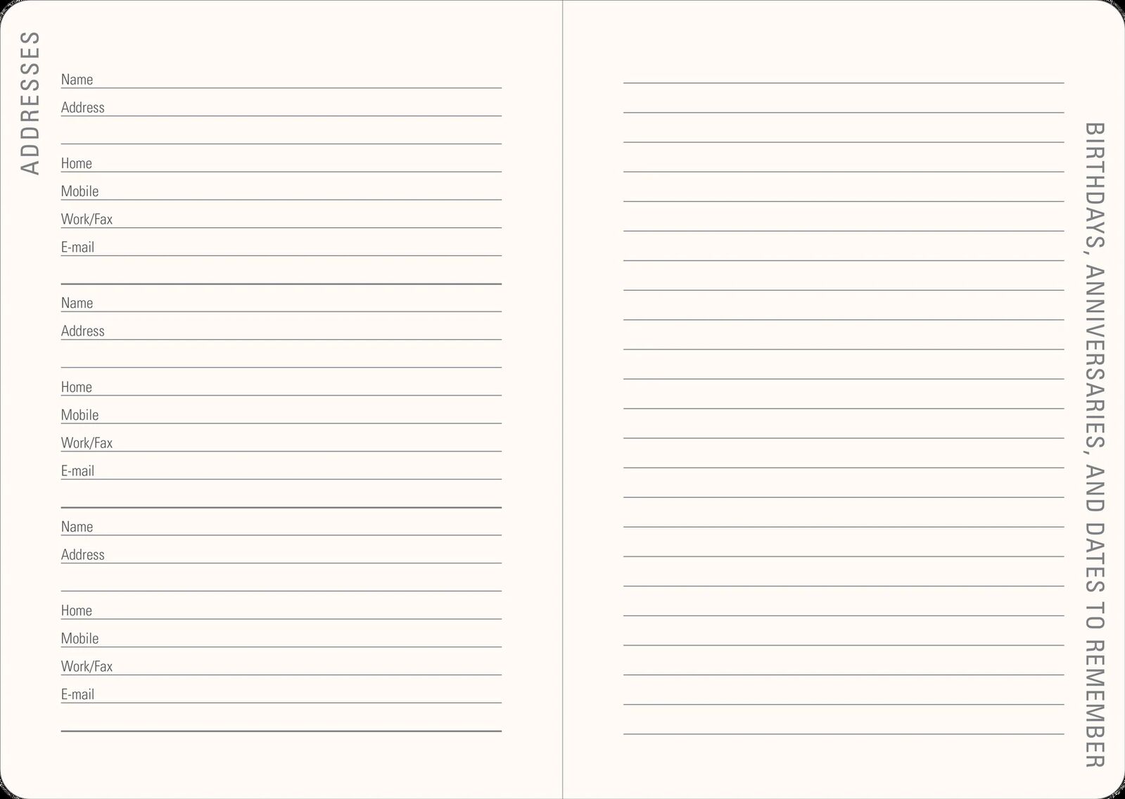 - Extra pages allow you to note key dates, and details about contacts.
