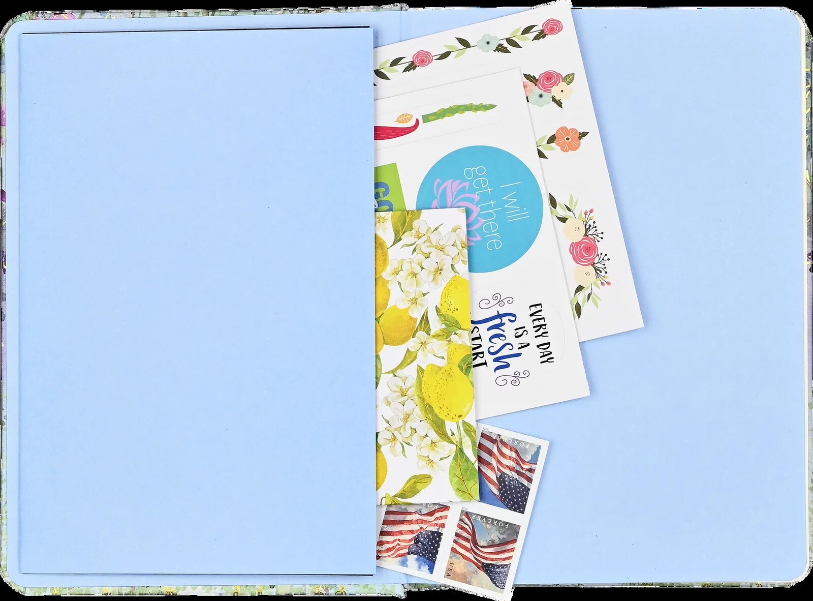 - Tuck notes and keepsakes within the expandable inside back cover pocket.