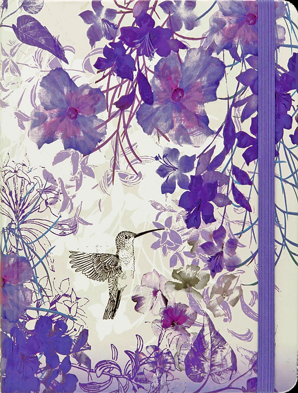 - Airy design features a delicate pen-and-ink hummingbird hovering amid a tumble of purple blooms.