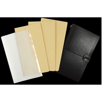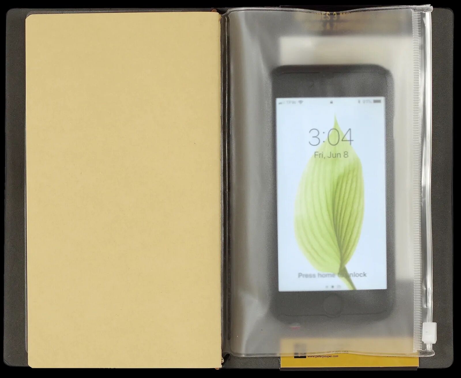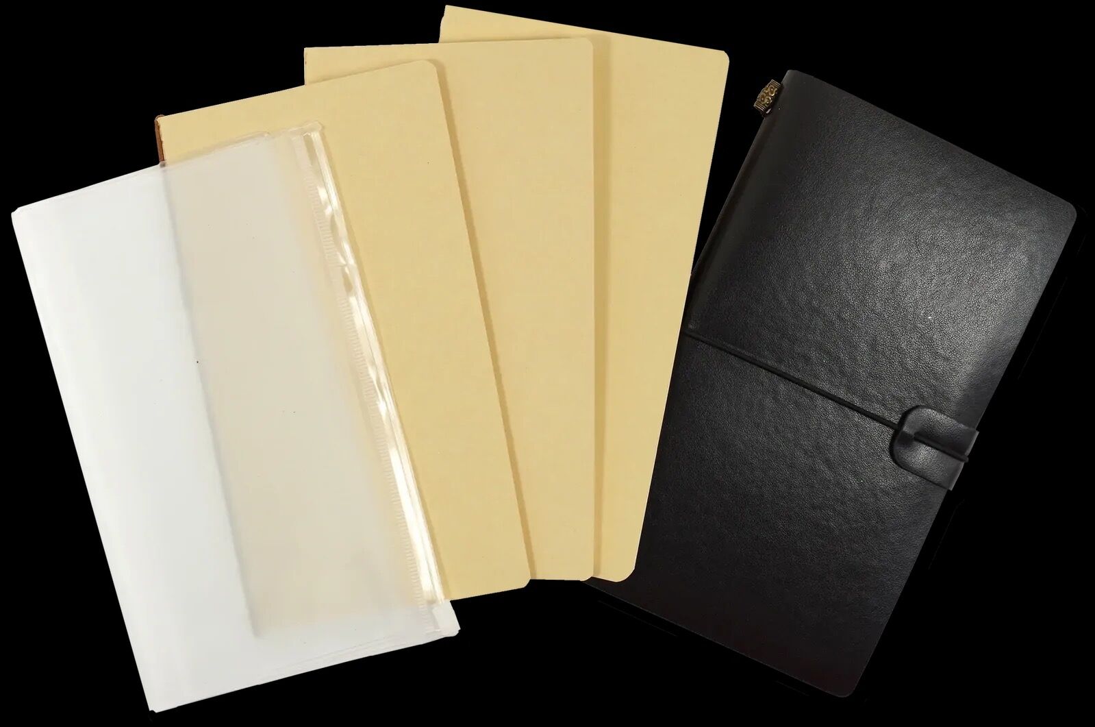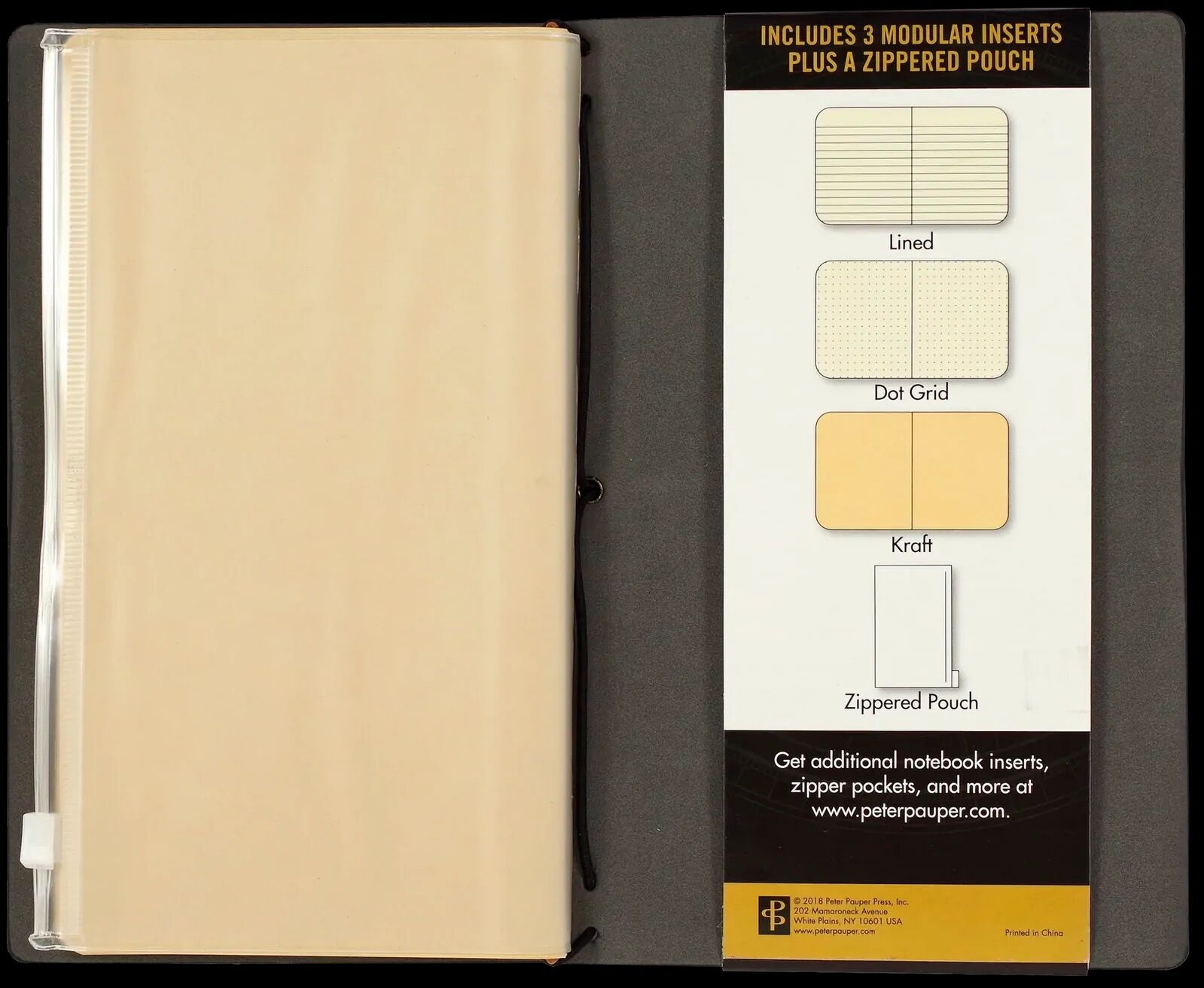 - A clear zippered storage pouch inside the back cover.
