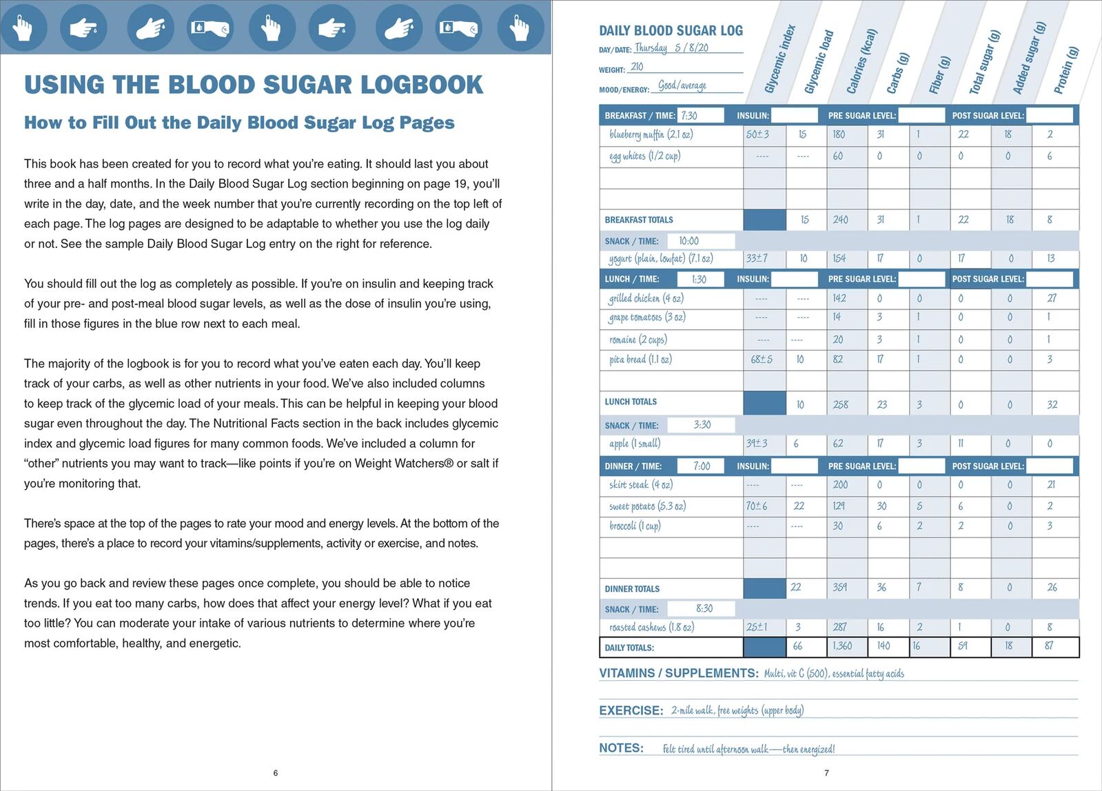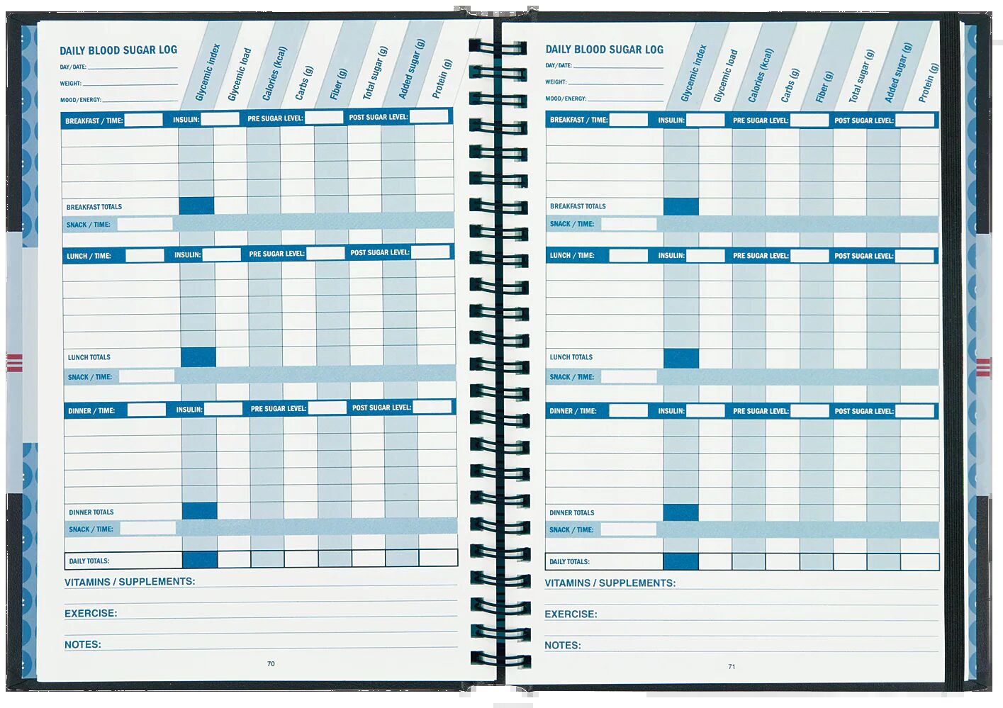 - Daily log pages for recording food and nutritional totals, blood sugar, mood and energy levels, supplements, exercise, weight, and more.