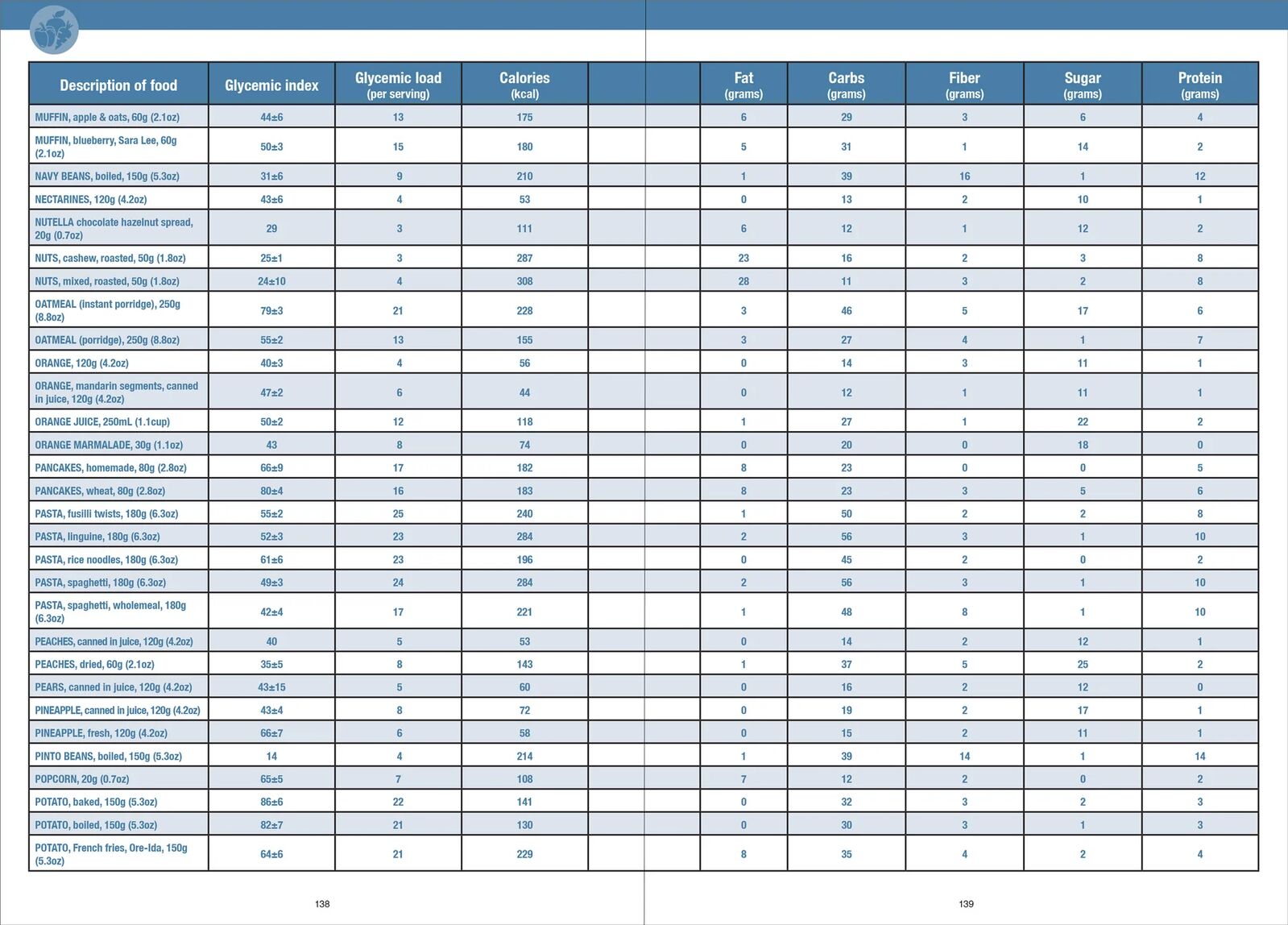 - Nutrition chart of popular foods with glycemic index and glycemic load data, plus calories, fat, carbs, fiber, sugar, and protein. Removable cover label /band.