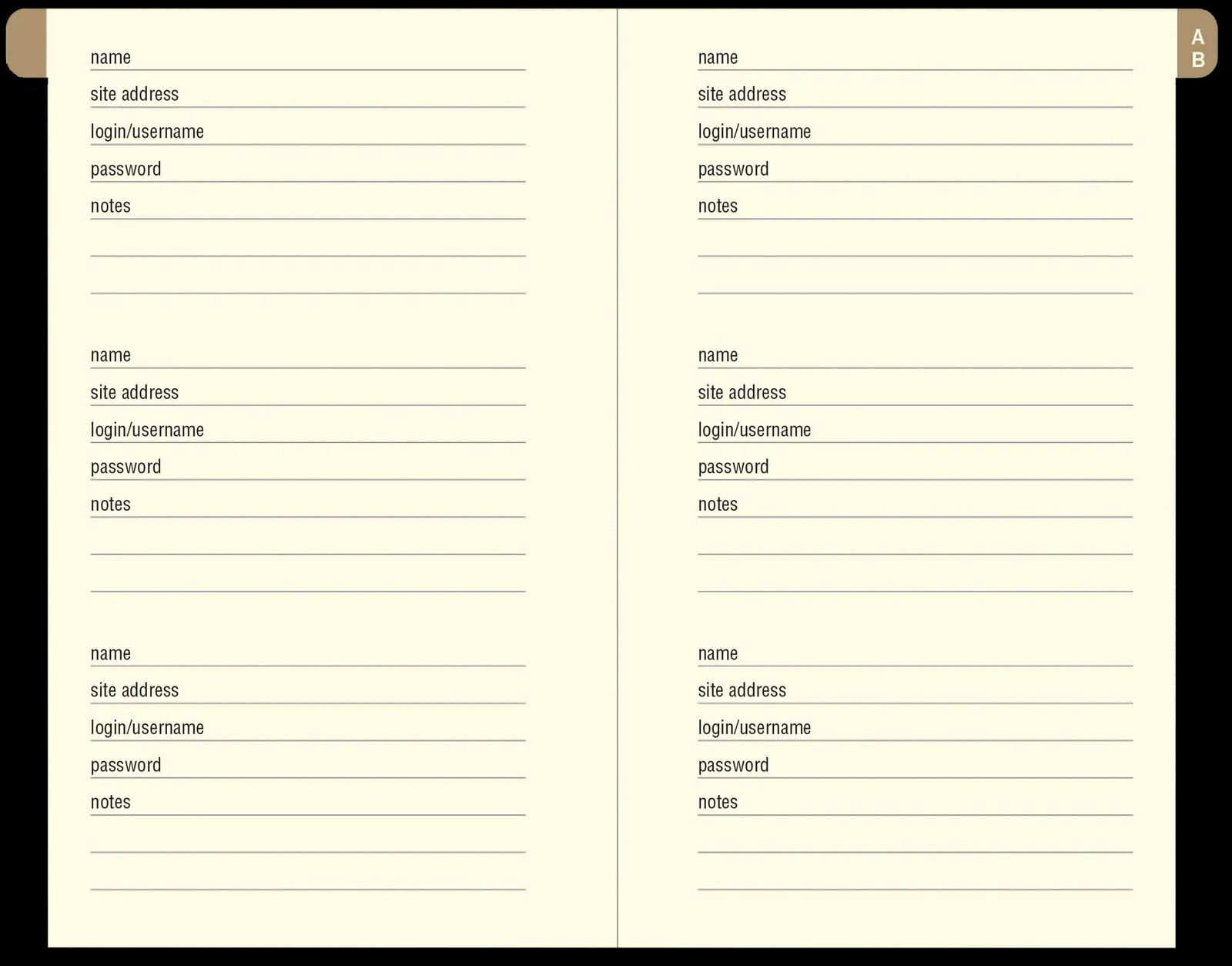 Tired of losing track of the websites you visit along with all those usernames and passwords? Now you can keep them all in one convenient place! This time- and headache-saving little volume is organized with tabbed A to Z pages with space on each page to write down websites usernames passwords and extra notes. You can also make notes about home network configurations software license numbers etc. in pages in the back of the book.
