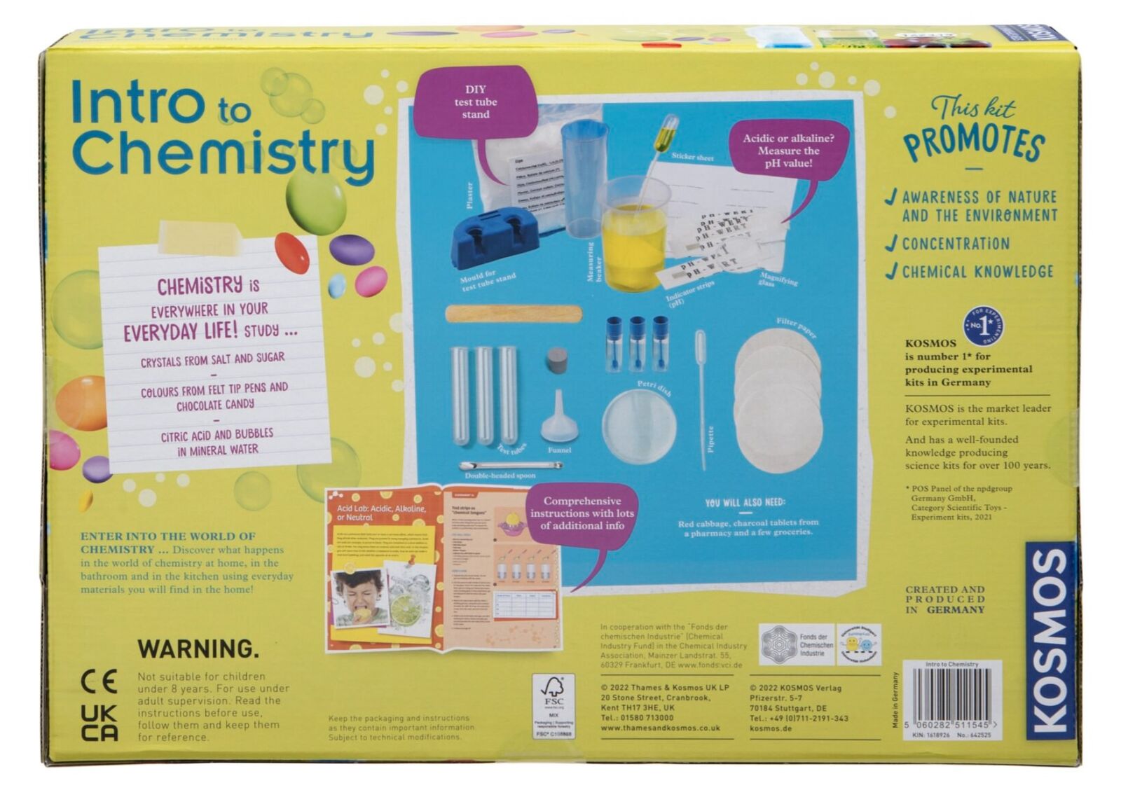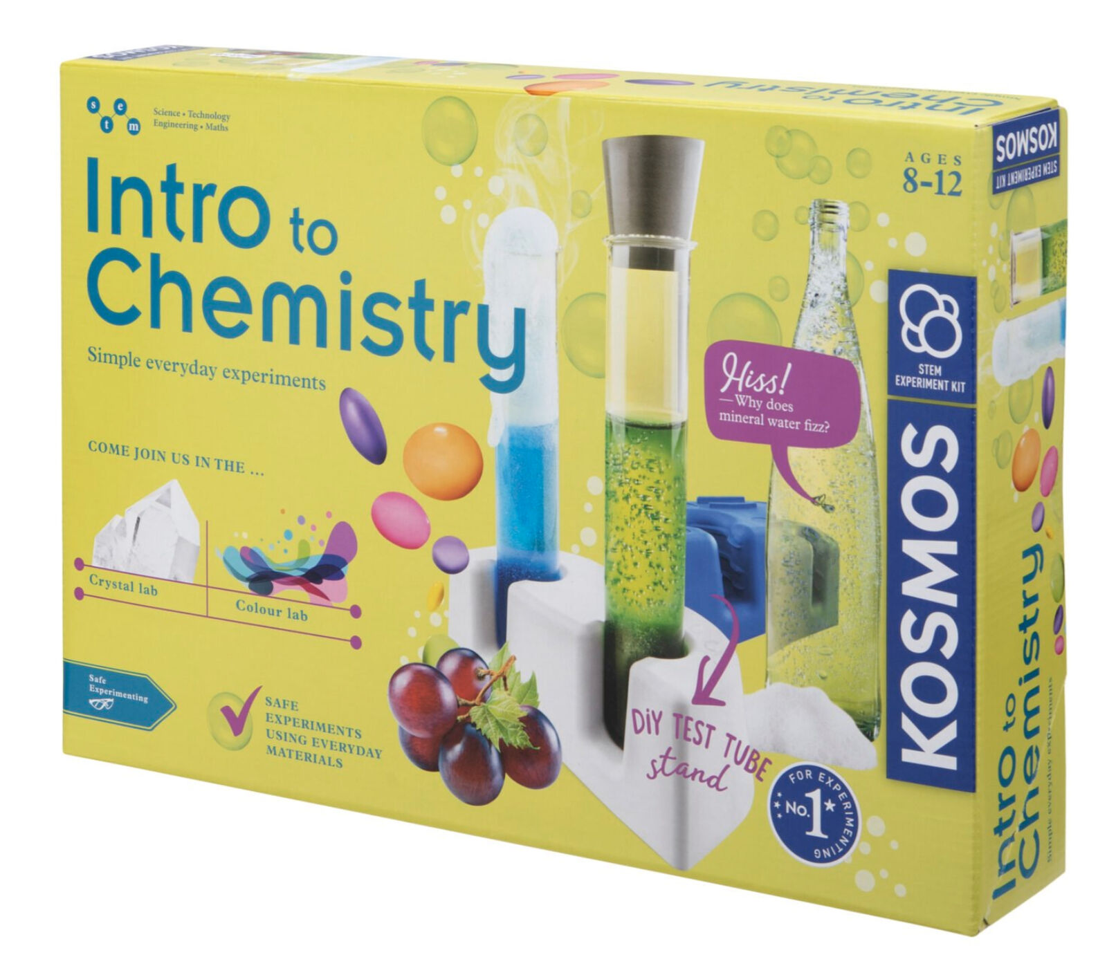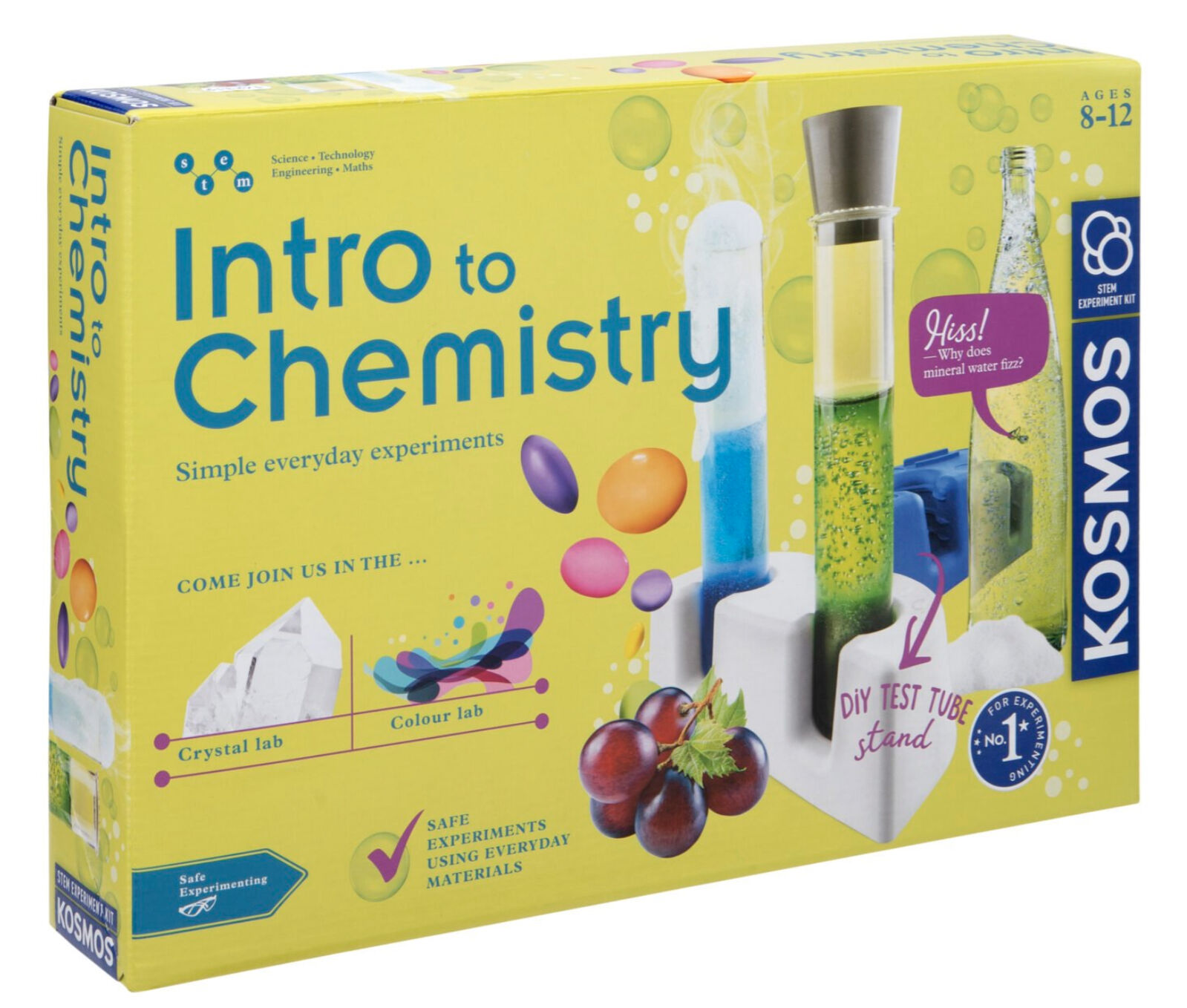 The Intro To Chemistry set kicks off a chain reaction of fun-filled experiments designed specifically for young kids. Junior chemists can safely explore simple chemistry using the tools in this kit and common household substances from the kitchen, bathroom, and laundry room.