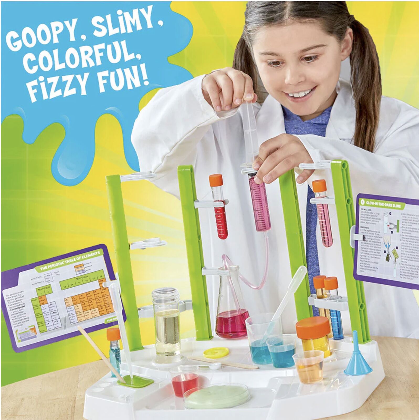 Ooze Labs Chemistry Station is a mini laboratory to help develop your lab skills. Grab your beakers and test tubes and step up to your special laboratory station for some exciting chemistry experiments. See how much fun chemistry can be as you do slimy, fizzy, colourful, and bubbly experiments. This cool laboratory setup has lots of different vessels and pieces of lab equipment so kids can play the role of chemist while doing real, safe experiments. All of the experiments use non-hazardous chemicals.