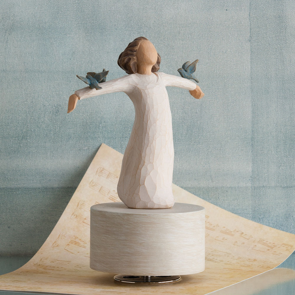 Happiness makes a wonderful commemorative gift for graduation, retirement, birthday, friendship, or for anyone with a love of nature. The full-scale, beloved figure of Happiness is perfect for the Musical format. When turning, the motion carved into her hair and dress, and the wings of the birds, all communicate movement, freedom, joy. Happiness is a happy piece! The hand-painted base elevates the figure while it turns beautifully to the classic Tchaikovsky's Waltz of the Flowers.